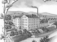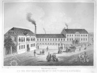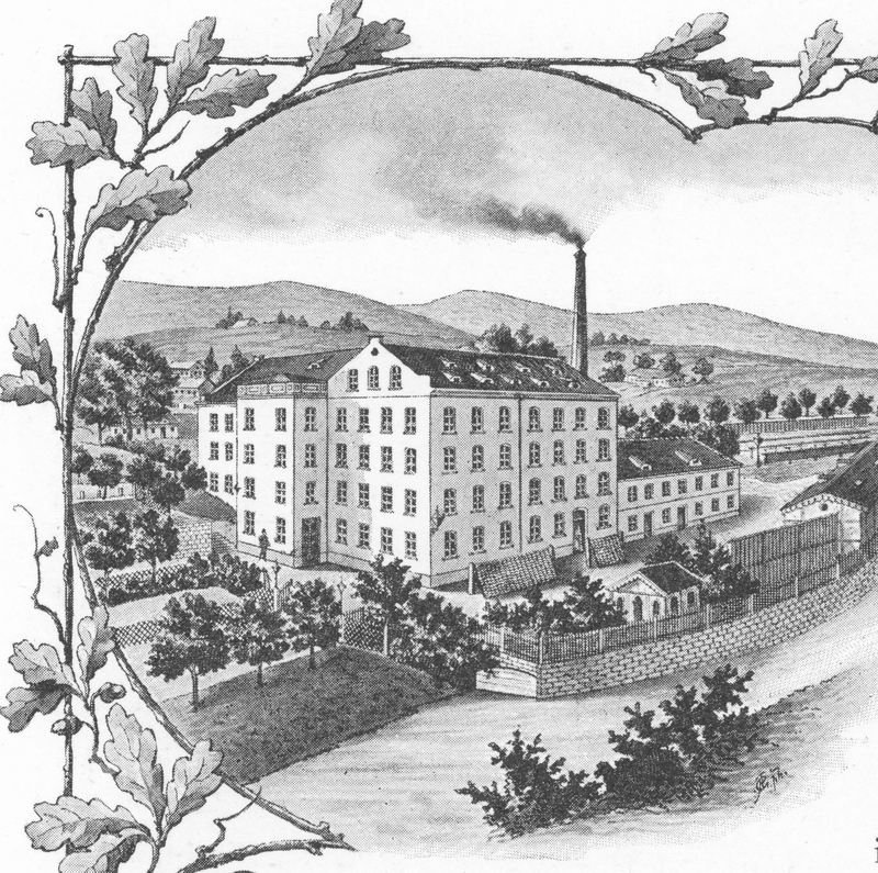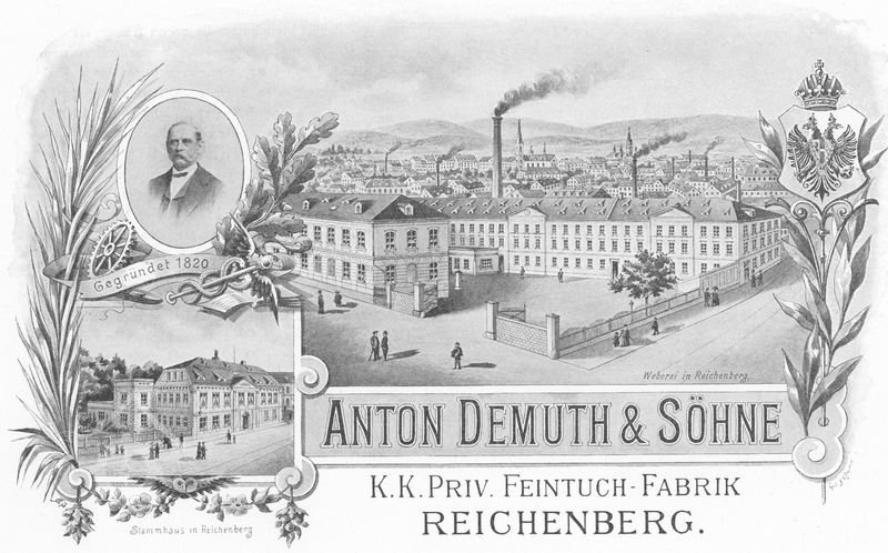 Továrnu nechala postavit firma Antona Demutha, který patřil do první generace továrníků-obchodníků. Společnost založil Anton Bernard Demuth již v roce 1808 a v roce 1826 převzal i klientelu svého tchána Gottfrieda Mölera patřícího do stejné skupiny obchodních a továrních pionýrů. V roce 1835 koupil rochlický mlýn, který přestavěl na dodnes existující továrnu stojící nedaleko Poštovního náměstí, v roce 1842 nechal postavit další tovární blok v samém centru Liberce. Roku 1852 byla továrna na dnešní třídě 1. máje dále rozšířena, další přestavba proběhla pod dohledem architekta Antona Ferdinanda Miksche v roce 1870. Zaříznutí jedné budovy tak, aby vyhovovala uliční linii, proběhlo v roce 1909. Dochovaná empírová hlavní budova se dnes nachází ve vnitřním bloku. Trojúhelníkový empírový štít je sice narušen dostavbou strojovny výtahu, ale stále nese i kulaté okno štítových hodin. Spolu se Schmidtovou továrnou na Papírovém náměstí se jedná snad o nejzachovalejší tovární objekt z první poloviny 19. století v Liberci.