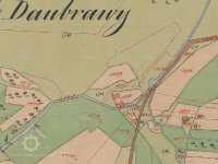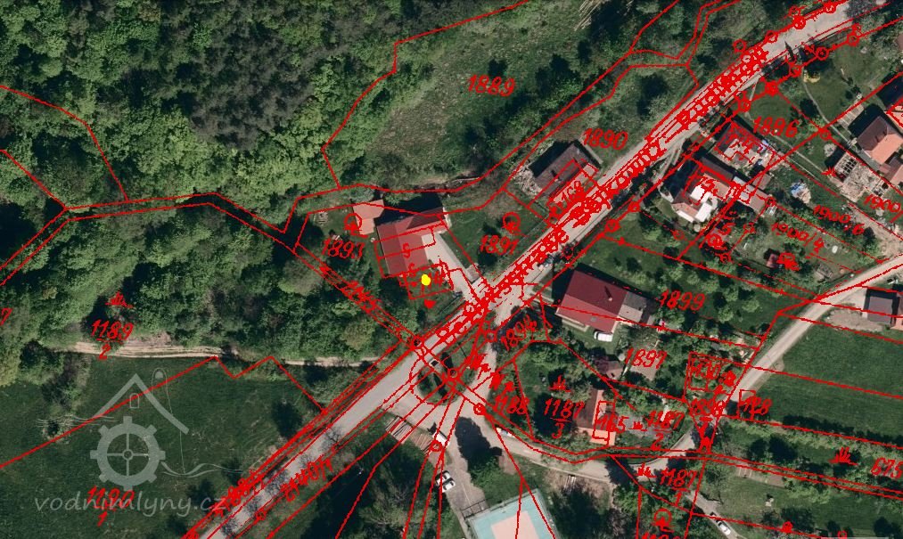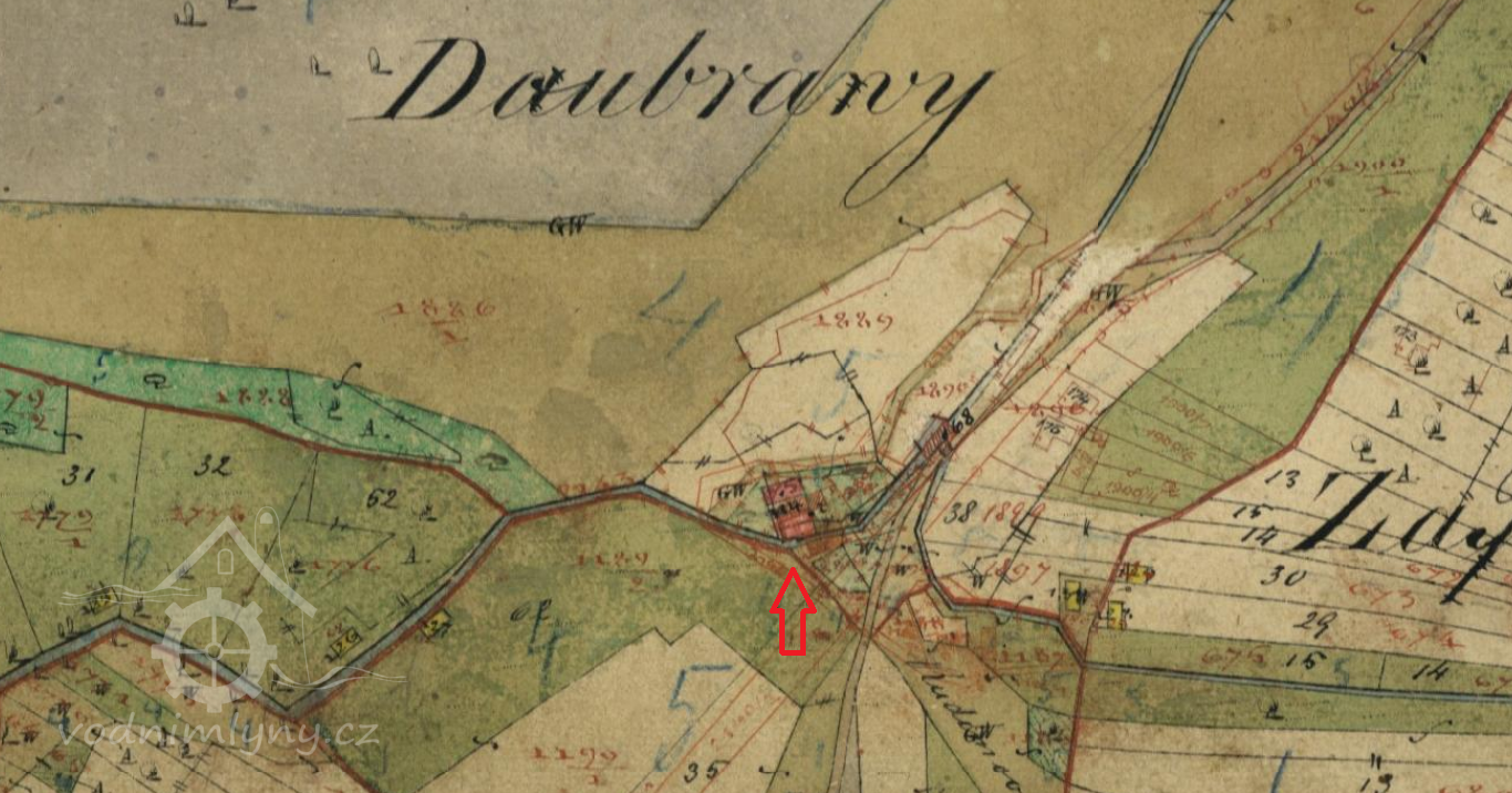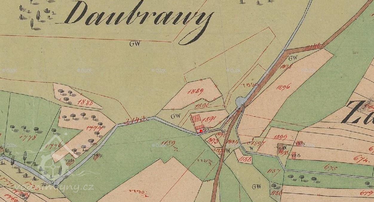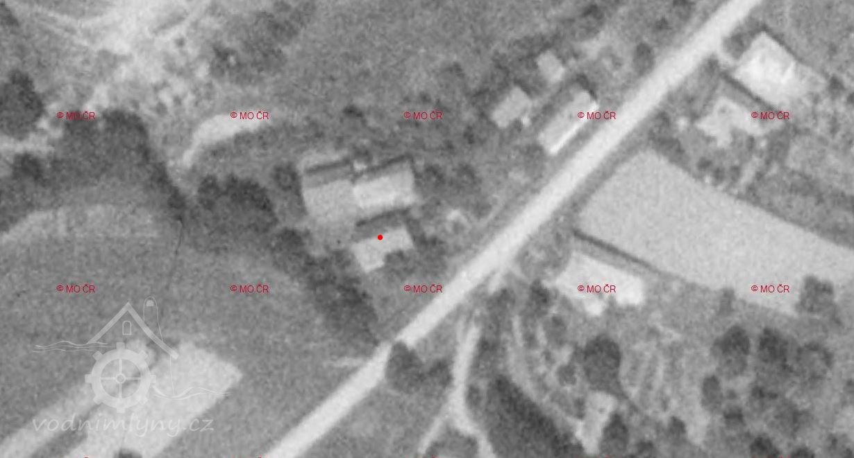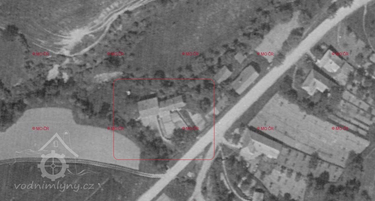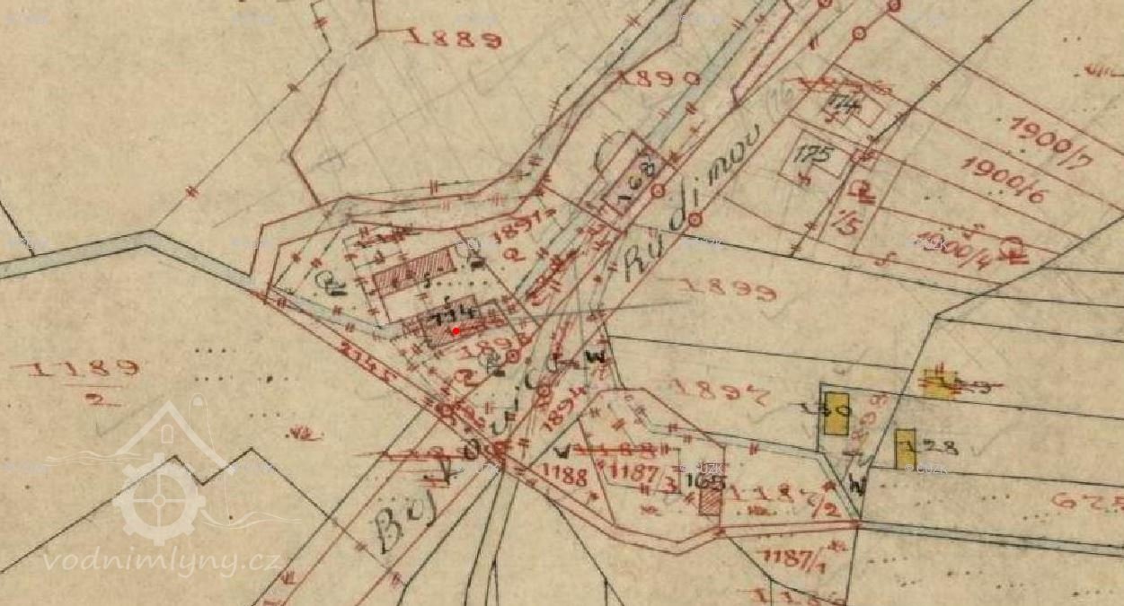 Na indikační skice z roku 1828 mlýn ještě nemá vlastní číslo popisné, čp. 75 se objevuje až po přístavbě sousedního stavení na mapě z roku 1877.