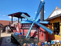 Hned druhý den začal potají vznikat za zdmi Černého továrny mlýn, který za krátko rozvířil poklidnou hladinu nejen v Kolovči, ale i ve všech vědeckých kruzích. Stavba mlýna za neustálého dozoru Černého rychle pokračovala. Jakmile byl mlýn hotov, zaučil rychle obsluhující personál a v noci nechal hotový mlýn přetáhnout do svého domu. Když nic netušící občané roku 1863 provázeli po Kolovči jako každoročně o masopustu průvod masek, vyjel ze vrat domu čís.1 podivný stroj tažený párem koní. Bylo na něm napsáno: „ Parní mlýn na přemílání starých bab v poměru 7:1“.Chasa, která mlýn obsluhovala, ihned začala svážet přihlížející staré báby na trakařích ke mlýnu a jakmile jich měla 7, naházela je do násypky. Po asi deseti minutovém mletí vyšla z mlýna krásná sličná panna. Užaslí diváci si žádali dalšího mletí, ale ten den se již nemlelo, protože se všechny báby schovaly, jaký měli z toho vynálezu strach. Jakmile průvod skončil, všichni rychle spěchali do hospody hnaný zvědavostí, jak dopadne sázka. V dobré náladě zasedli a čekali na oba aktéry. První přišel Černý. Hned ve dveřích ho přivítal potlesk všech hostů. Takovou událost ještě Koloveč nezažil. Poroučeli mu kořalky a jen kdyby byl tak hodnej a jejich báby taky přemlel. K pobavení všech vytáhl notes a tužku a začal si pečlivě všechny zájemce zapisovat. Když se ovšem ve dveřích objevil Moda, dosáhlo veselí vrcholu. Hned mezi dveřmi spustil: „ je to podvod, nic nezaplatím, kdo to jakživ slyšel, aby se mlely starý báby na mladý děvčata“.Tím ovšem jen přilil do ohně a burácivý smích na několik minut zaplnil hospodu. Když se poněkud hosté uklidnili, řekl Černý: „ když jsme sázku uzavírali, tak se nemluvilo o tom, co se bude mlít, jen kdo bude první. A to jsem byl já. Ale ať rozhodne purkmistr a radní, kdo sázku vyhrál.“ Představitelé obce povstali. Jen s velkým vypětím sil se snažili udržet vážnou tvář .Purkmistr pronesl: „ sázku vyhrál Černý a ty Modo musíš zaplatit sud piva a to hned.“Se sklopenou hlavou šel Moda k hostinskému, vytáhl peníze a sud zaplatil. Sedl si k ostatním a snažil se pít co nejrychleji, aby škoda kterou utrpěl, byla co nejmenší. Osm rychle vypitých piv mu dalo zapomenout na prohranou sázku a na znamení smíru podal Černému ruku. Od té doby byli dobrými kamarády. V roce 1865 společně založili druhou kolovečskou cihelnu.