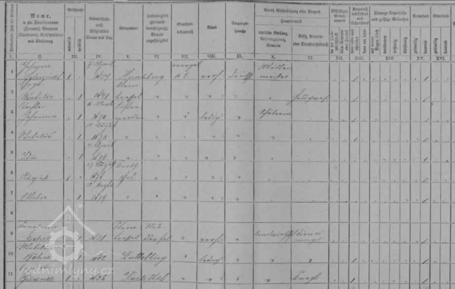 V roce 1880 mlýn vlastní mlynář Johann Schmidt, nar. 1837, manželka Matilda nar. 1841.