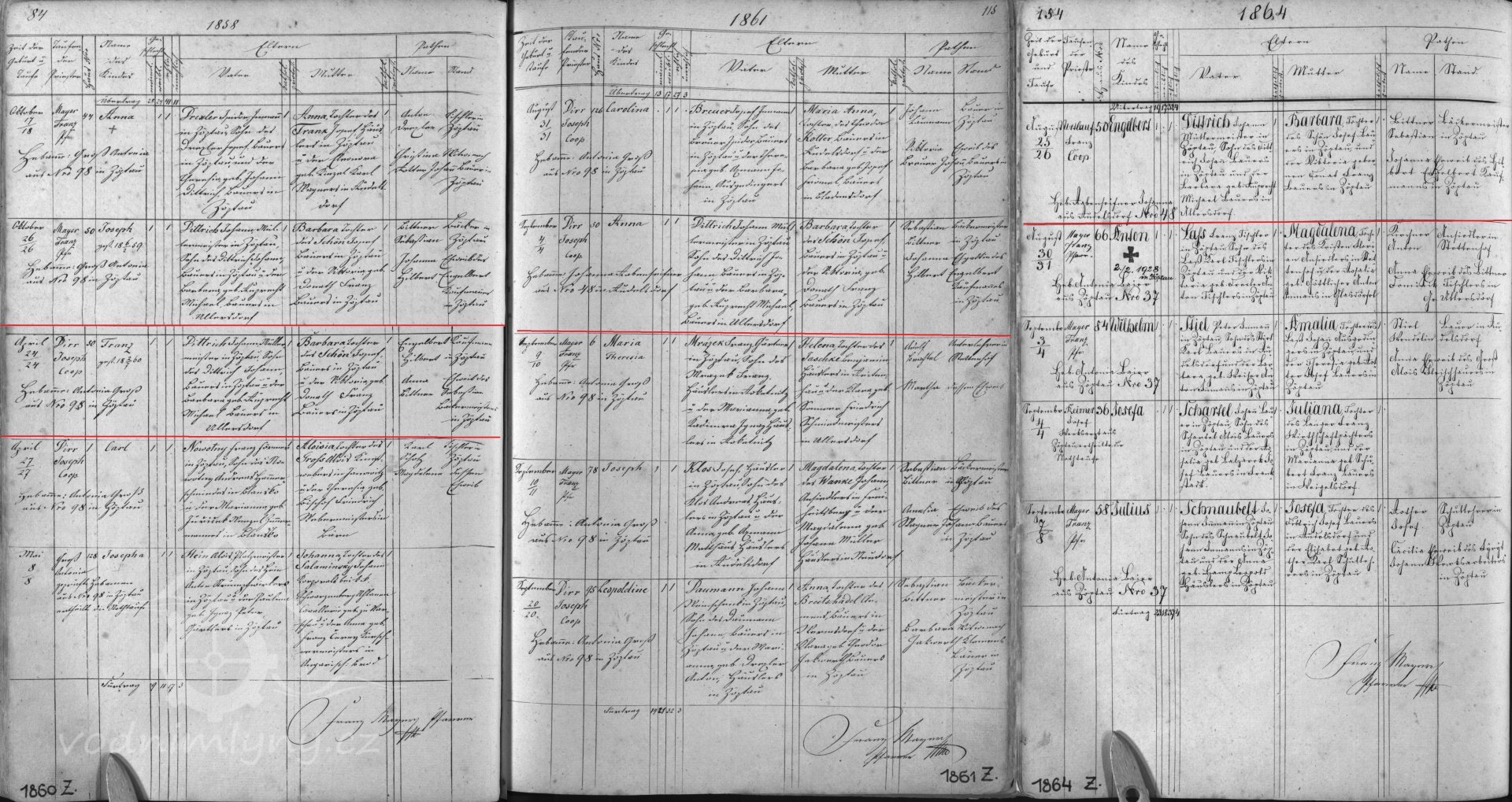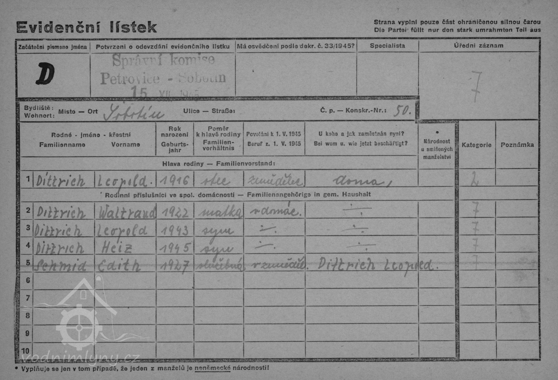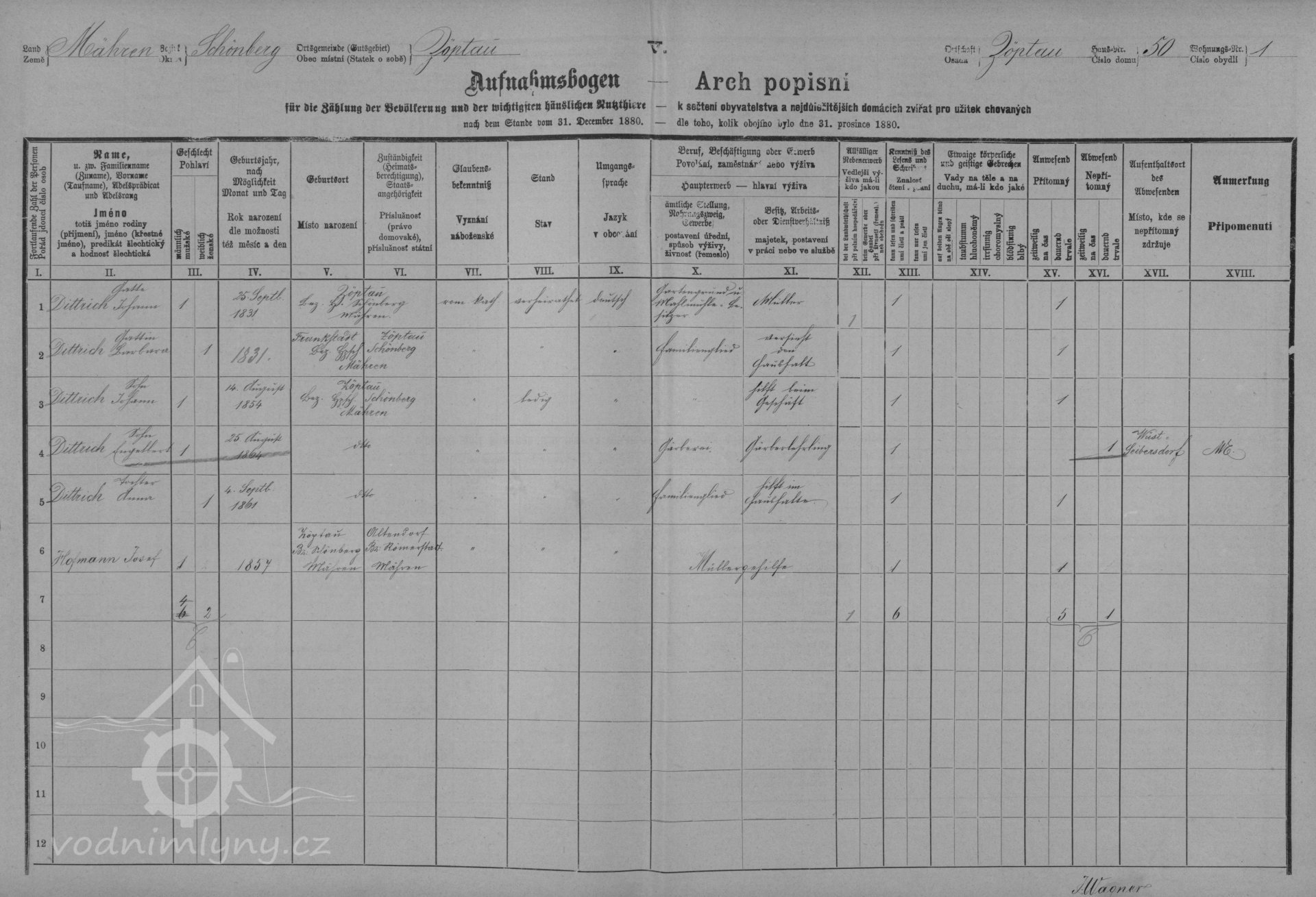 V roce 1854 - 1880 mlýn vlastní mlynář Jahann Dittrich nar. 1831, manželka Barbara nar. 1831, v roce 1854 se jim narodil syn Johann, v roce 1855 dcera Barbara, v roce 1857 syn Franz, v roce 1958 syn Joseph, v roce 1860 syn Franz, v roce 1861 dcera Anna, v roce 1864 syn Engelbert.