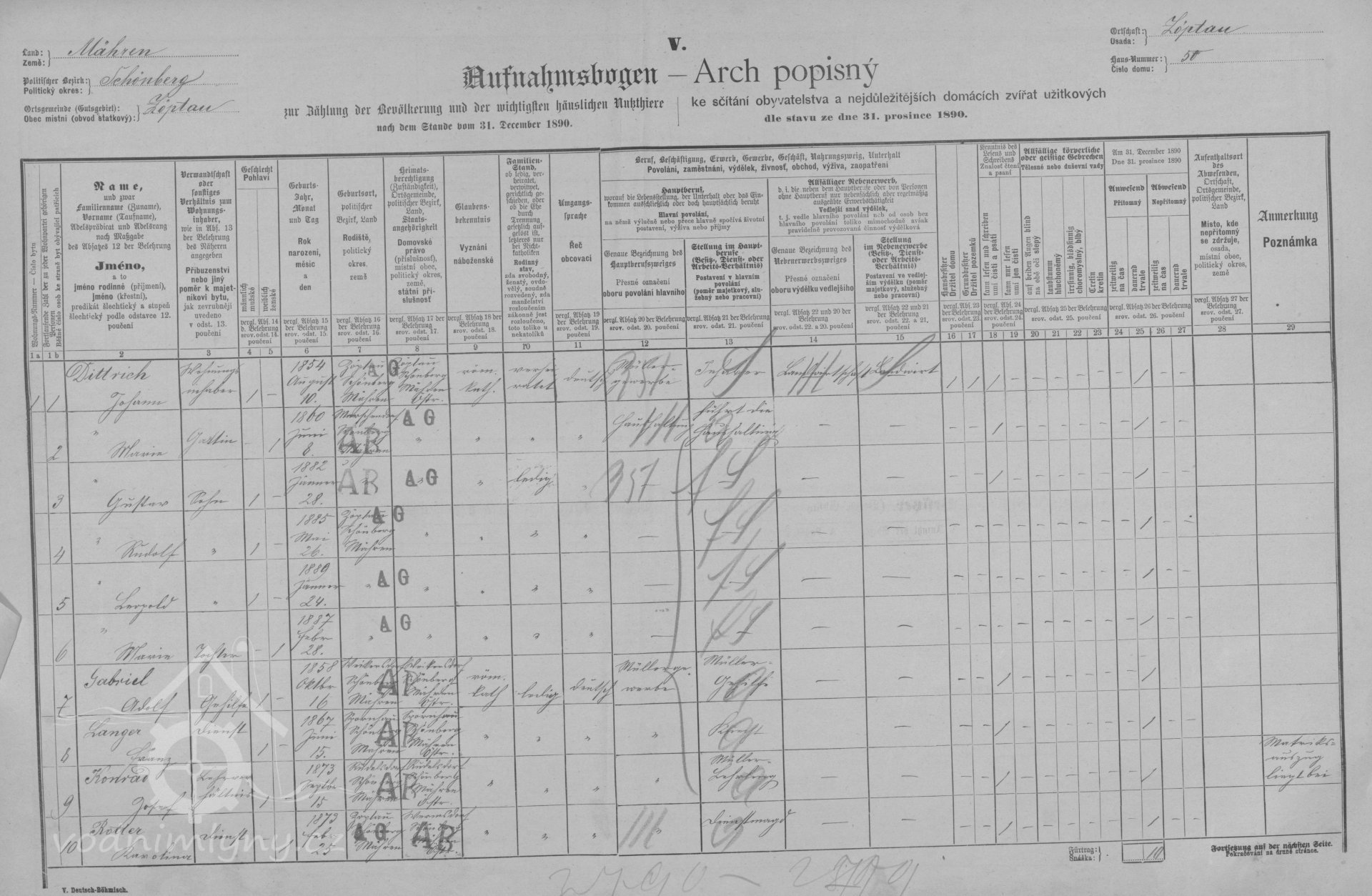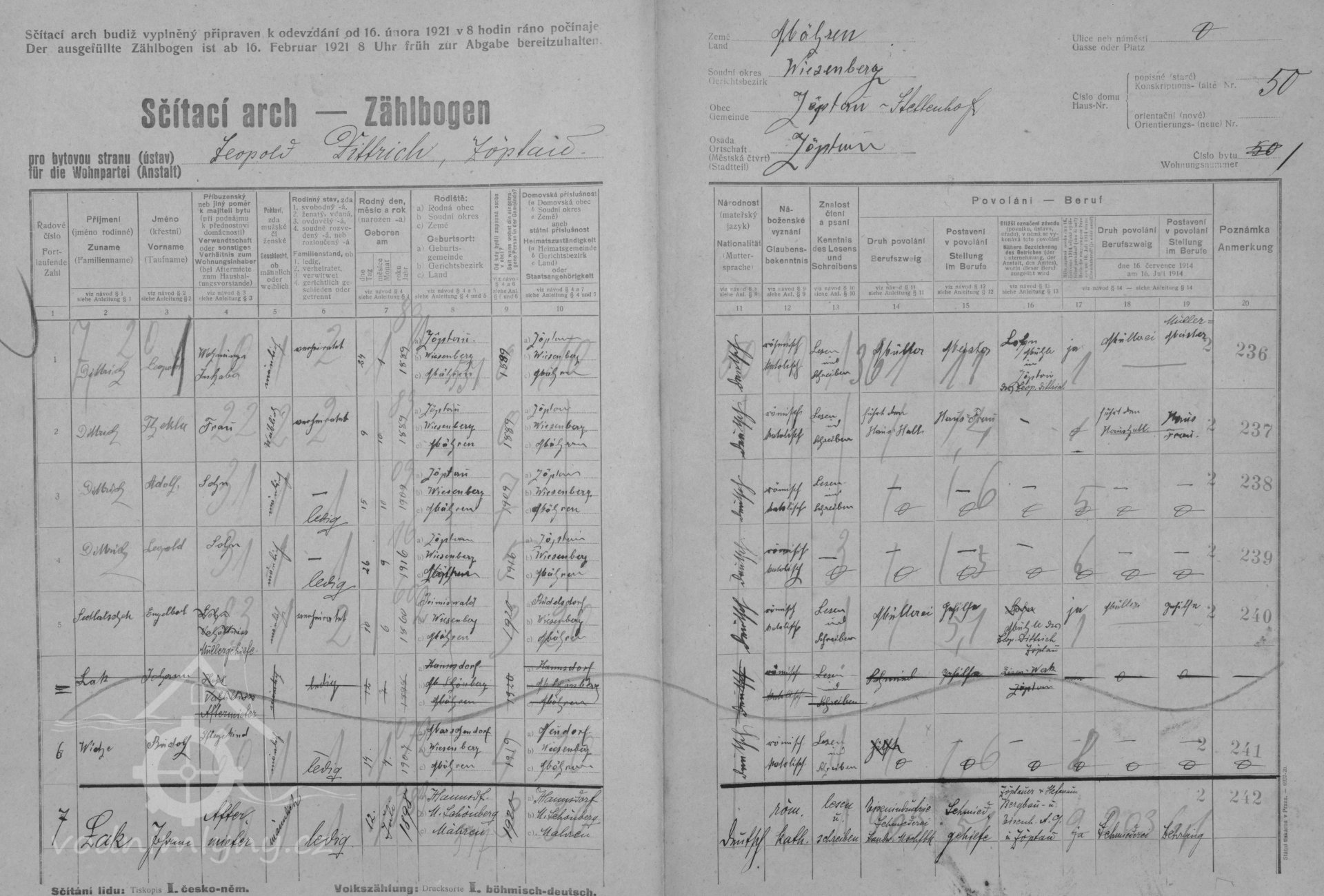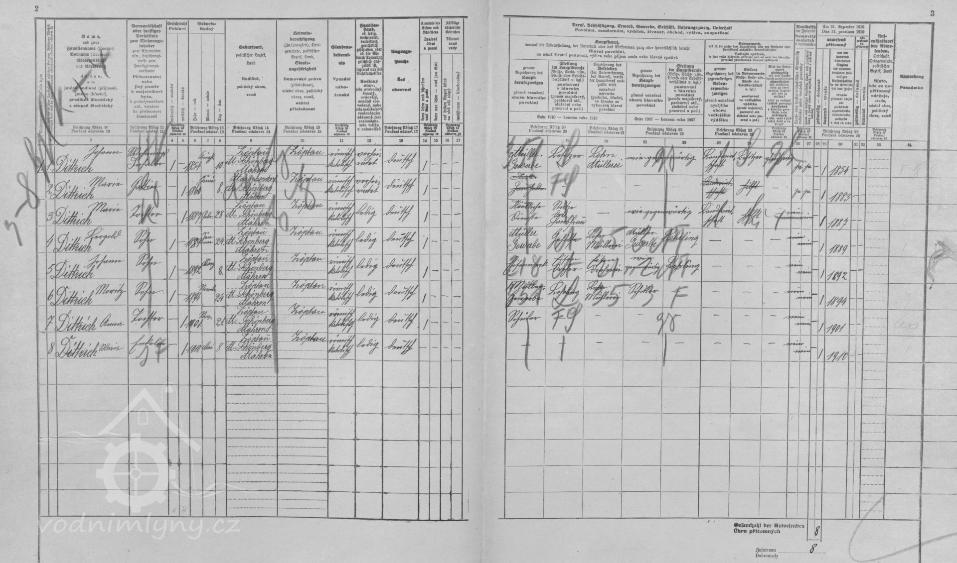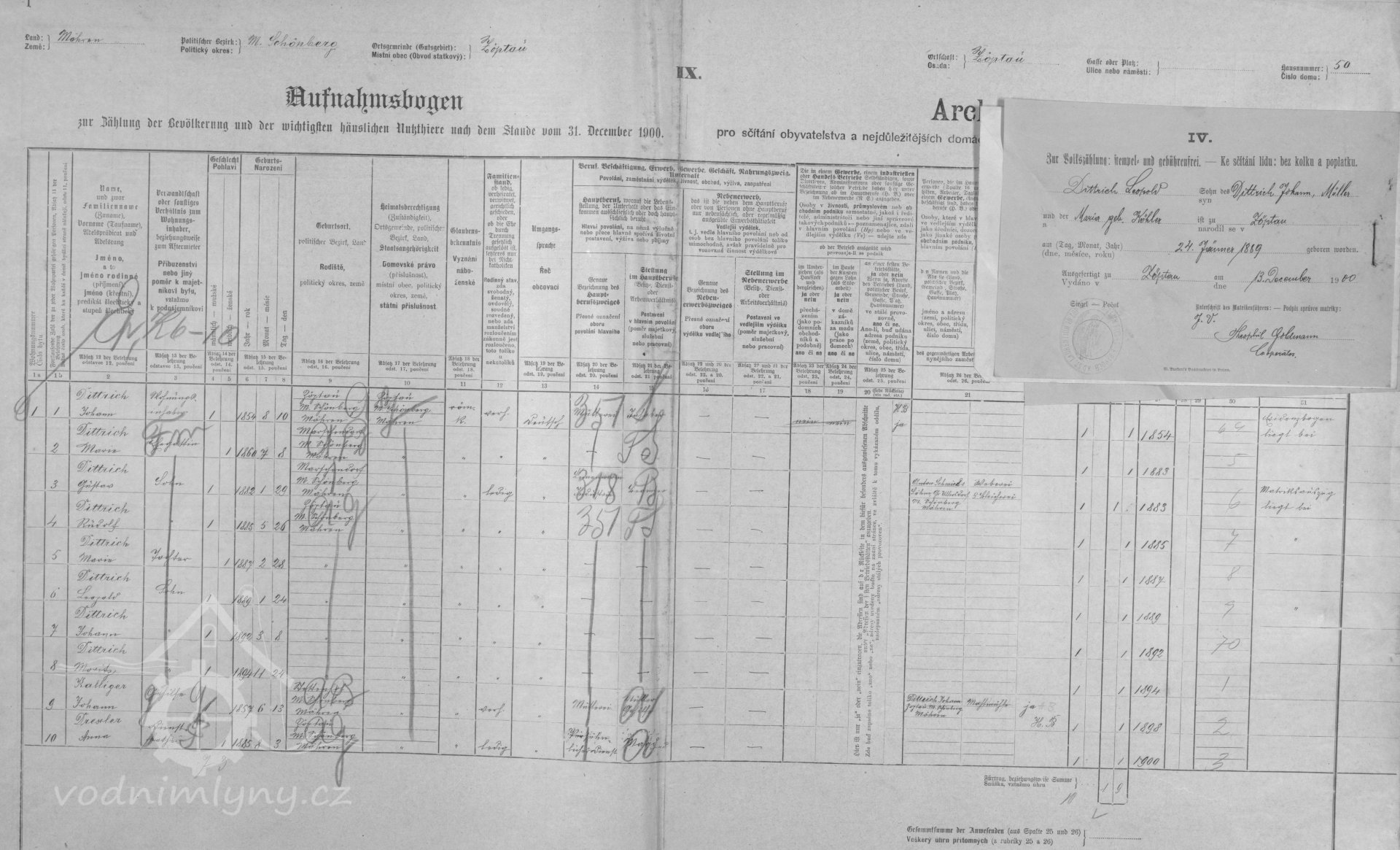 V roce 1890 - 1910 mlýn vlastní mlynář Johann Dittrich nar. 1854, manželka Maria nar. 1860, v roce 1887 se jim narodila dcera Maria, v roce 1889 syn Leopold, v roce 1892 Johann, v roce 1894 Moritz, v roce 1901 dcera Anna.