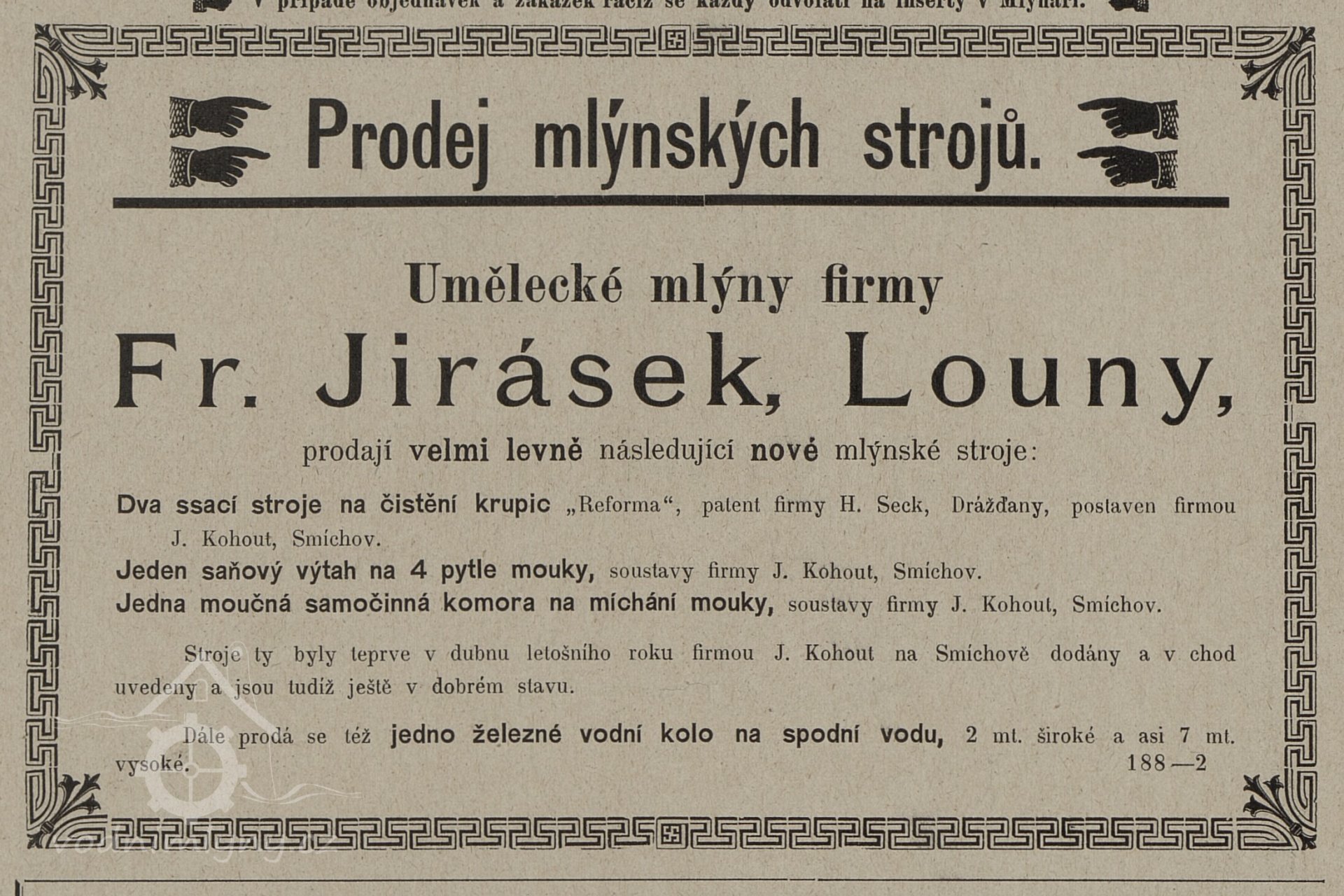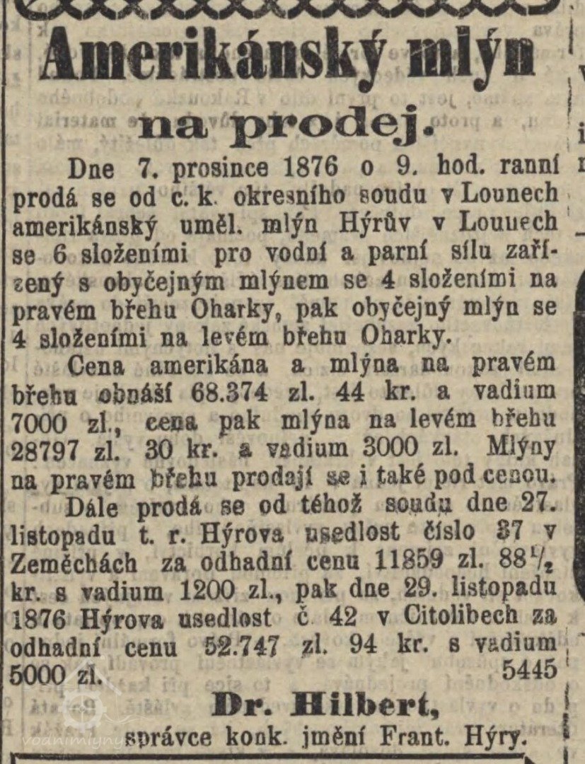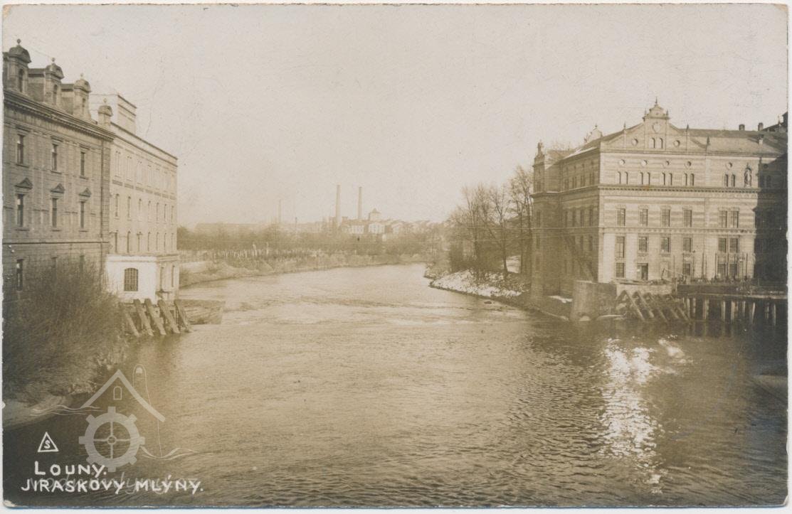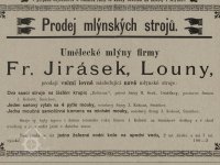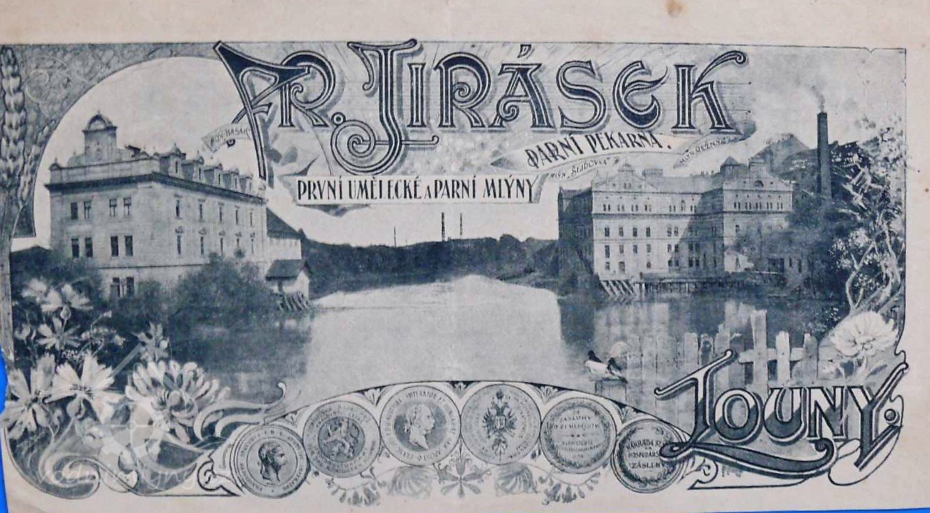 1877 založena firma František Jirásek, první umělecké a parní mlýny v Lounech