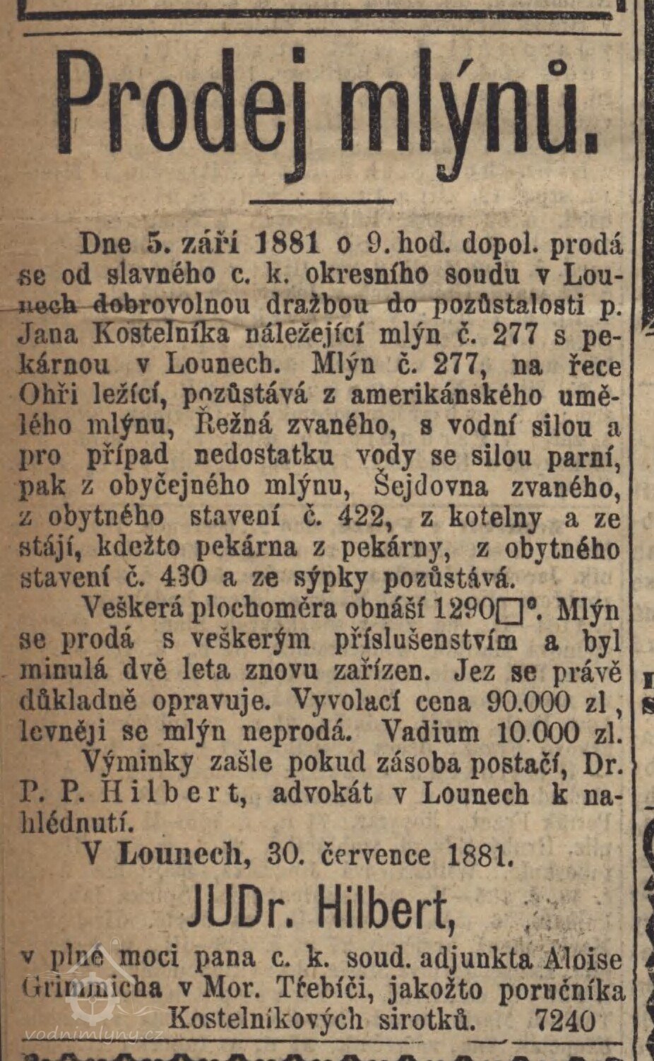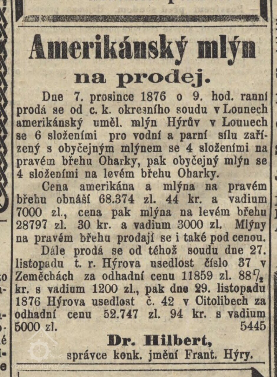 1877 založena firma František Jirásek, první umělecké a parní mlýny v Lounech