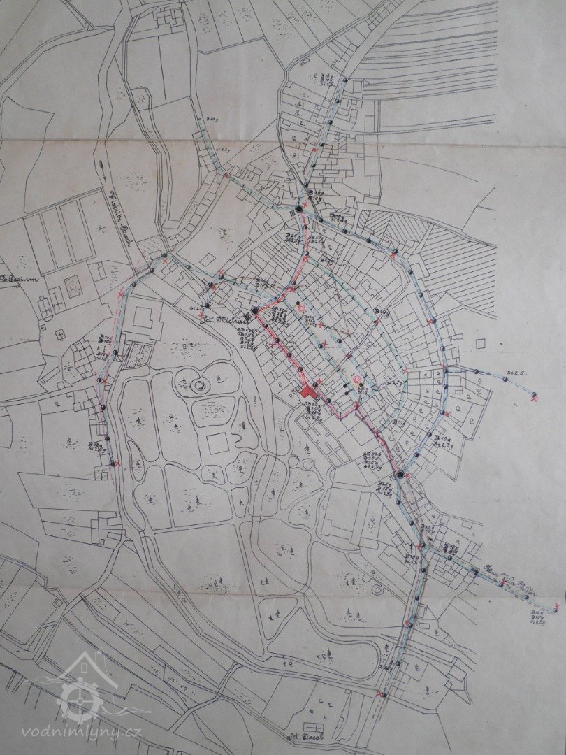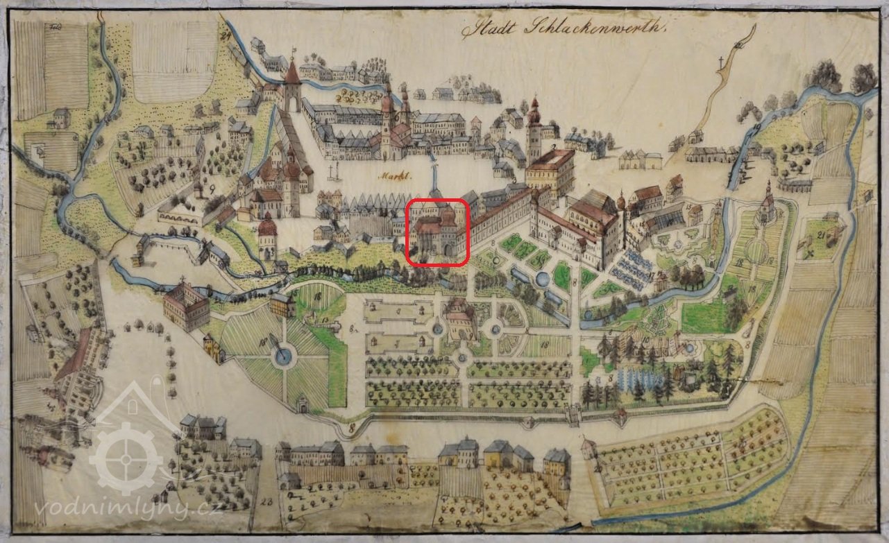 Za opravenou Věží velkého muže, na parcele č. 98 v bývalé Řeznické ulici č.p. 111(dnešní Žižkova), byla jedna z lokalit, kde se po staletí využívala vodní síla. Nikdo asi nezjistí, kdy se vybudoval náhon z Jáchymovského potoka anebo kdy se roztočilo vodní kolo moučného mlýna ,,Stadmühle". Náhon zde byl už roku 1525 odkrytý, musel se čistit a občas způsoboval malé zátopy. U horní brány byl odběr vody a dřevěnými trubkami se zásobovala horní a dolní kašna na náměstí. Až do roku 1838 byly kašny dřevěné, pak kamenné. V polovině 16 století bylo v Ostrově 5 mlýnů (o pátém přesně nevíme, kde stával), kde mlynáři provozovali své živnosti. Další zmínka je z roku 1632, kdy mlýn koupilo ostrovské panství za 2300 zlatých od Christopha Wernera. V roce 1794 ale byl zase prodán měšťanům a to za 835 zlatých a 42 krejcarů s tím, že panstvu bude nadále platit činži ve výši 200 zlatých. Při velkém požáru roku 1607 byl zmíněn mlýn ve městě o 4 složeních (jedno složení představují dva mlýnské kameny), ke kterému vedl náhon, sloužící také k máchání prádla a máčení kůží. V roce 1665 byly ve městě ještě 4 mlýny (Neumühle, Stadtmühle, Steinbrückemühle, Weissemühle) a roku 1731 už jen tři. Weissemühle byl zrušen a podle J. Kühnla se zde v 17. století řezal kámen pro početné sochy (neboť v roce 1685 začala stavba nového zámku). Poté zde máme zaznamenány majitele z katastrálních knih, kdy v roce 1860 koupil polovinu nemovitosti Johan Nauthe, kterou pak předal svým třem dětem. V roce 1887 se vlastníkem jedné poloviny stávají pánové Johann Dotzauer a Leo Wolf a druhé poloviny Judr. Heinrich Zloch a Karl Vogl. Poté se majetky převádí v rámci rodin a v roce 1910 se stávají majiteli Friedrich Dotzauer a ing. Robert Wolf. V roce 1930 jsou majiteli nemovitosti, včetně stavidla na Jáchymovském potoce Gustav a Bohumir Bukert.