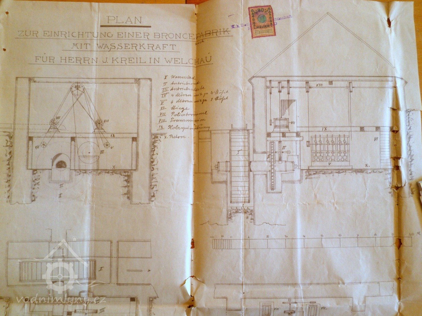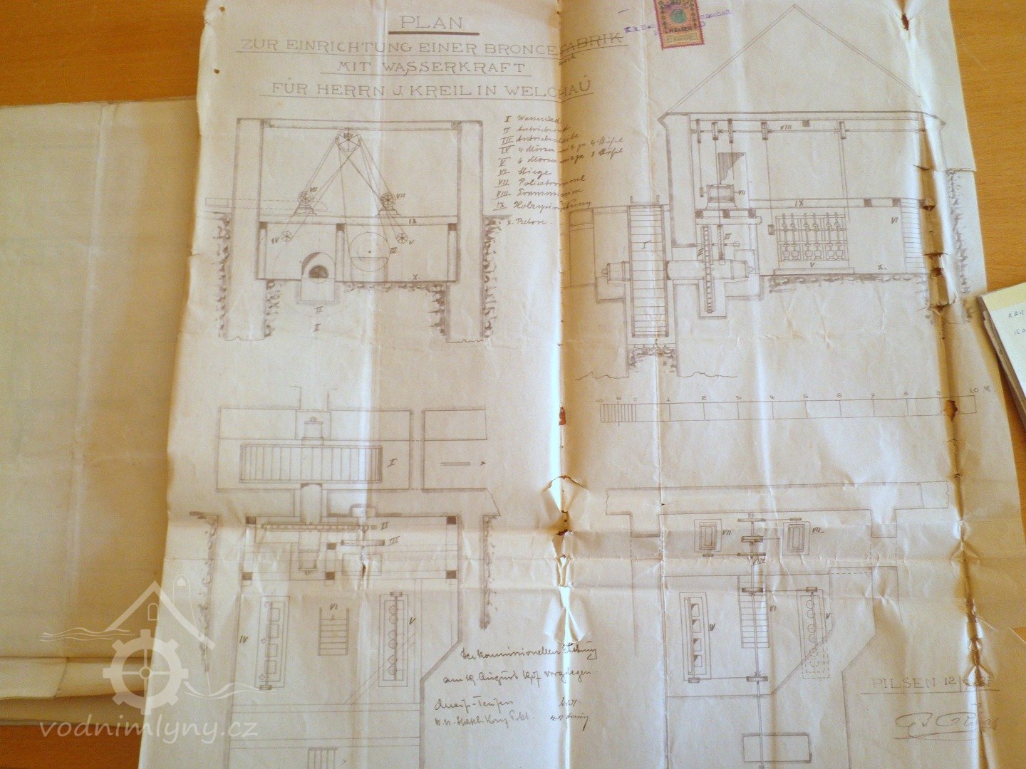 V instalovaných hmoždířích se kovový odpad z mosazi, cínu, mědi atd. suchým způsobem drtí na prášek a v lešticích bubnech se tento prášek leští s malým přídavkem olivového oleje a stearinu, přičemž je zcela vyloučeno jakékoli znečištění vody nebo provozovny zdravotně závadným odpadem. Přikládám své potvrzení o dani z příjmu pro mlynářské řemeslo a s úctou oznamuji, že tento nový provoz na výrobu bronzu budu pod svou osobní odpovědností provozovat společně se společníkem Josefem Kreismannem, který je 56 let starý a a je příslušný do Velichova, pod názvem společnosti: „Bronceerzeugung Josef Kreismann und Johann Kreil in Welchau bei Carlsbad“ (Výroba bronzu Josef Kreismann a Johann Kreil ve Velichově u Karlových Varů).