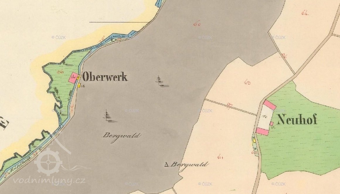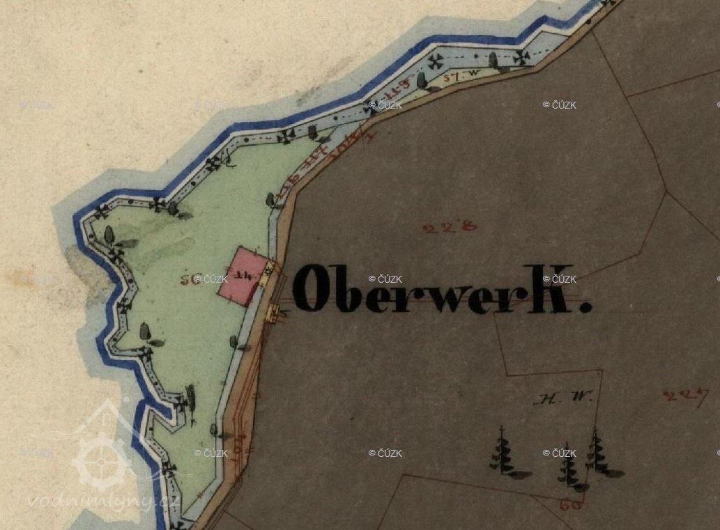 Objekt bez topografického názvu napojený na vodní náhon nebo doplněný značkou vodního provozu tu zaznamenávají historické mapy po celé 18. a 19. stoleti. Na mapě z roku 1838, která sloužila jako příloha vodních knih, je provoz označen názvem Oberwerk č.p. 10, dle názvu tu tudíž stával jeden ze sklářských zušlechťovacich provozů.