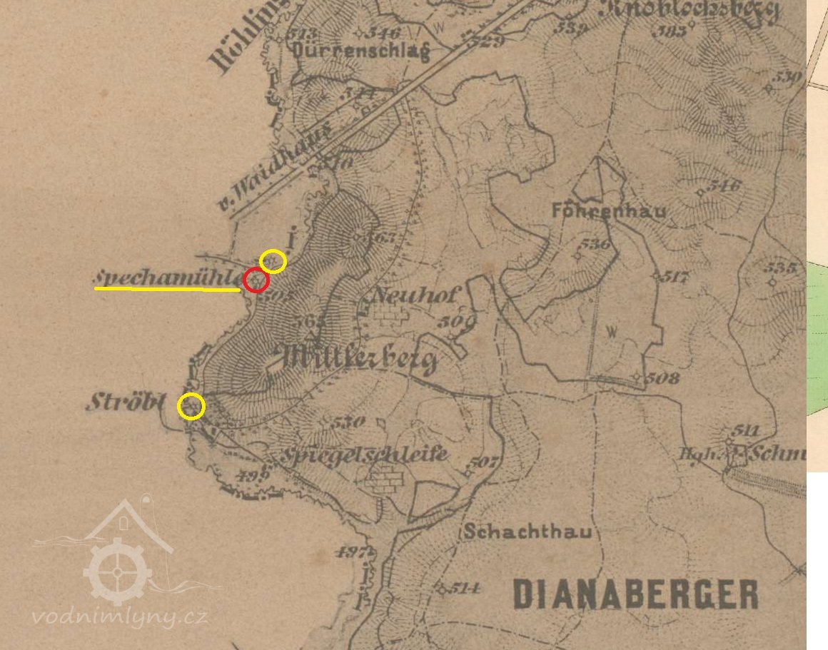 Místo, kde stával nejstarší hamr, který po úpravě hranice připadl po roce 1362 k Čechám, můžeme zcela hypoteticky klást do míst tzv. Nového mlýna Zatímco Specknerův mlýn leží za Hraničním potokem na německé straně, zbytky Nového mlýna nalezneme jen kousek odtud na české straně. Provoz který byl před zánikem nazýván Novým mlýnem, má rovněž pestré dějiny, které by si zasluhovaly hlubší historickou studii. Schematické vyobrazení střebelského hamru přináší mapa Tobiase Schubharda z roku 1629 zachovaná v kopii z roku 1763. Na mapě zemské hranice u Waidhausu z roku 1706 byla lokalita s hamrem, položená na falcké straně hranice, nazývána Ober Ströbl. Ležela na samostatné cestě směřující z Horní Falce do Rozvadova. V té době zřejmě dosahovala stejného významu jako Dolní - Česká Střeble, kde se nacházel dvůr se sídlem majitelů statku. Situace na mapě z roku 1706 názorně zobrazuje vodní náhon, který se pod Horní - Falckou Střeblí odděluje od Hraničního potoka a směřuje do České Střeble. Na počátku tohoto koryta je na české straně zobrazena značka vodního provozu, kterou můžeme ztotožnit s pozdějším Novým mlýnem.
