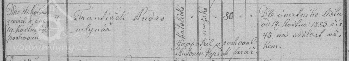 2. 8. 1883 zemřel mlynář František Andrs st. ve věku 80 let.