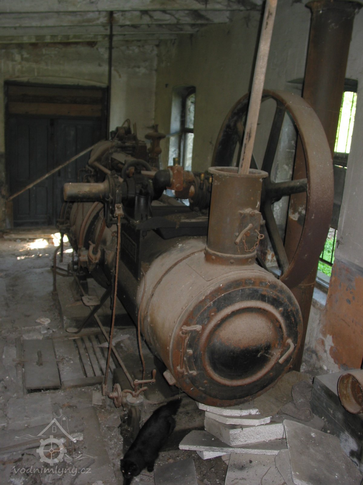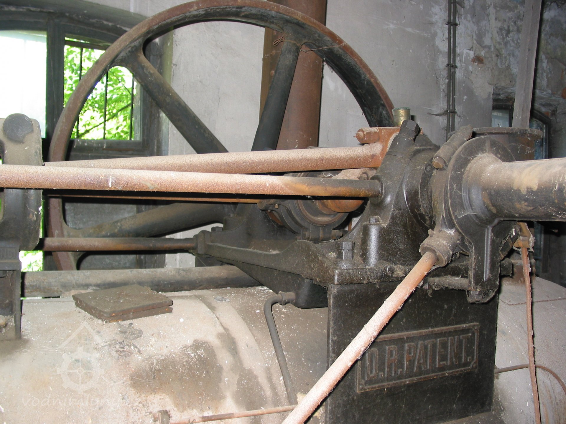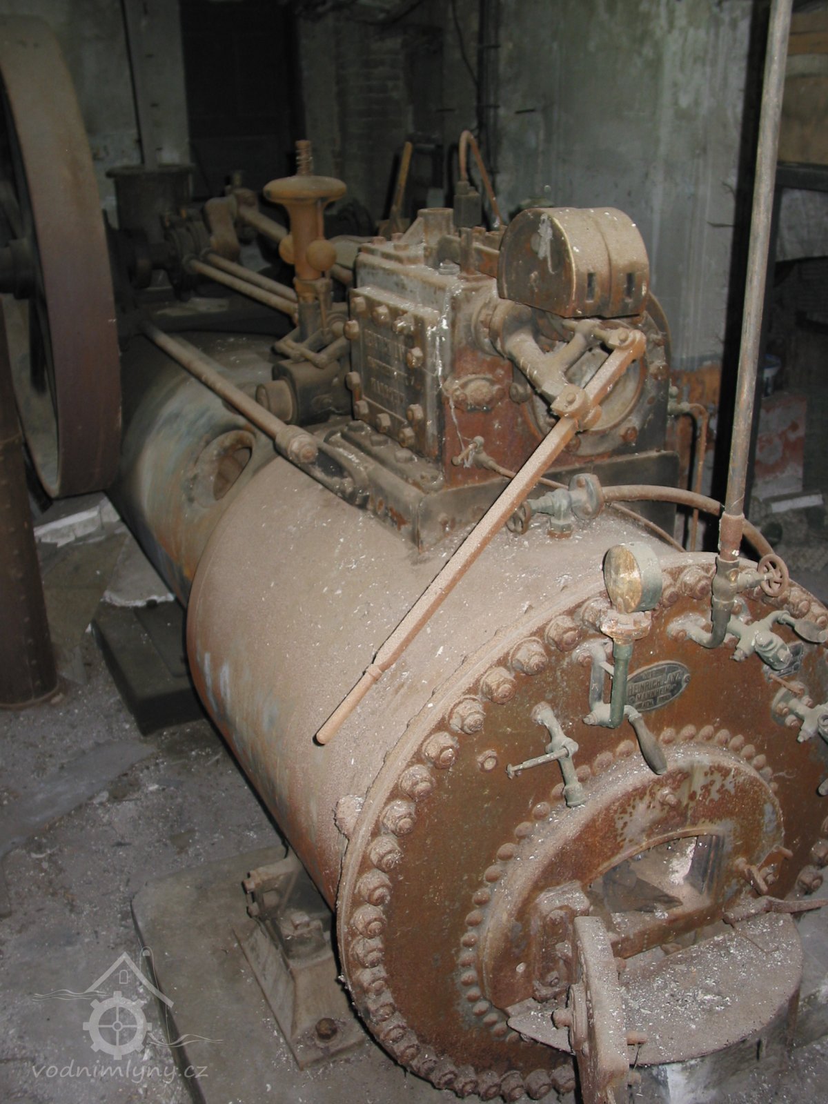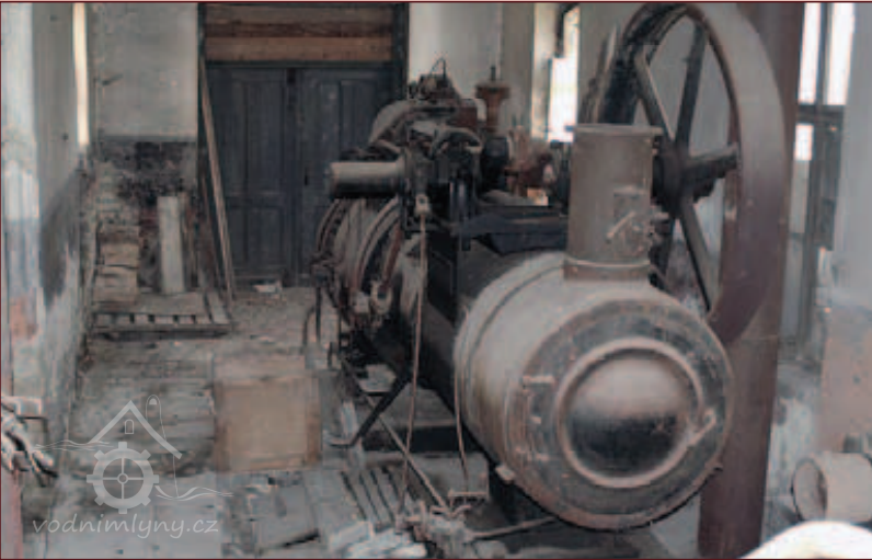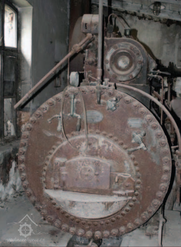 Detail parního strroje s výrobním štítkem, 2013, © Vodní mlýny na Frýdecko-Místecku, (Prvky na obrázku: Pomocný motor, značka výrobce na vodním motoru)