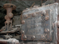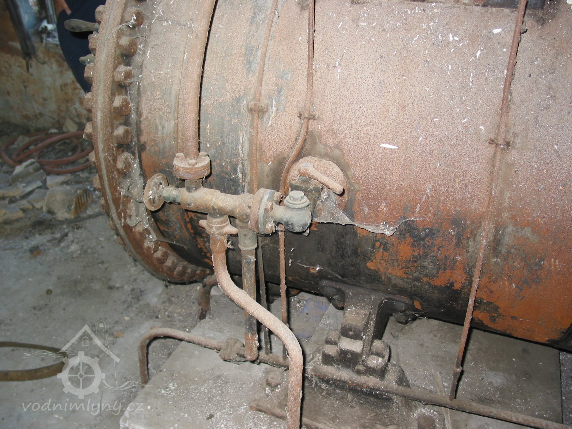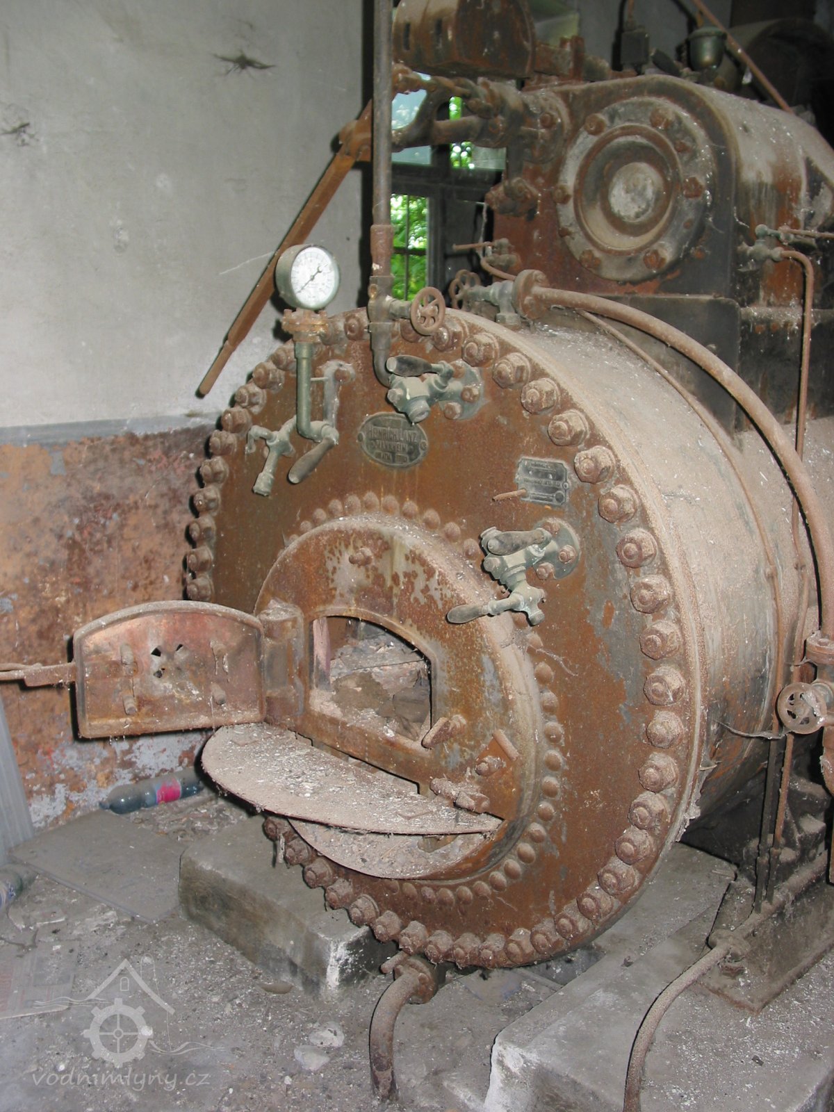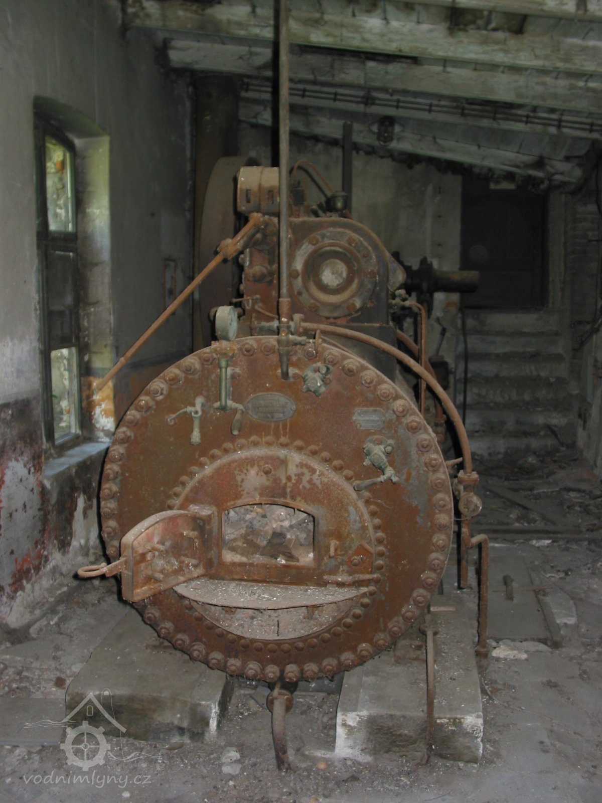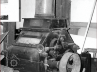 Detail parního strroje s výrobním štítkem, 2013, © Vodní mlýny na Frýdecko-Místecku, (Prvky na obrázku: Pomocný motor, značka výrobce na vodním motoru)