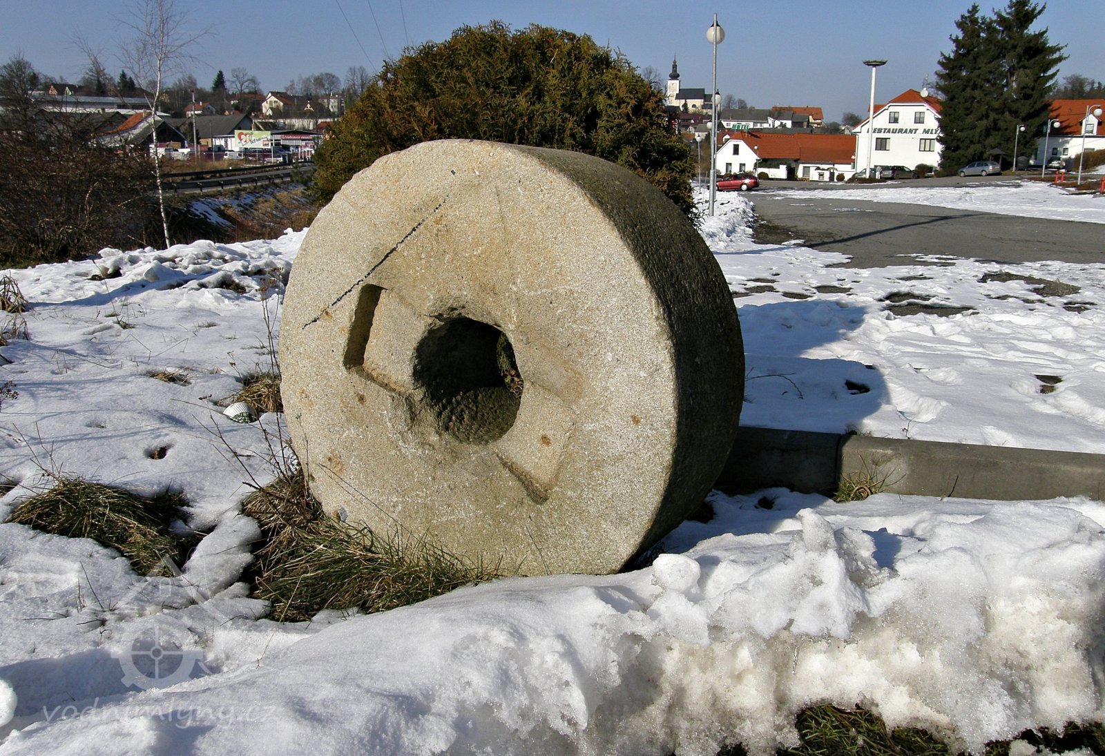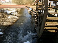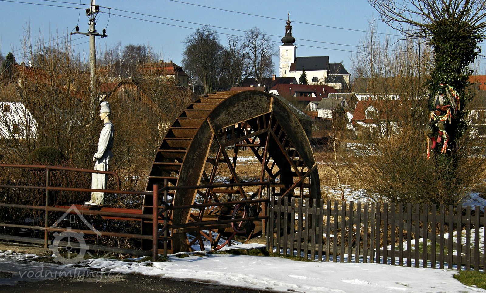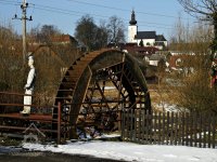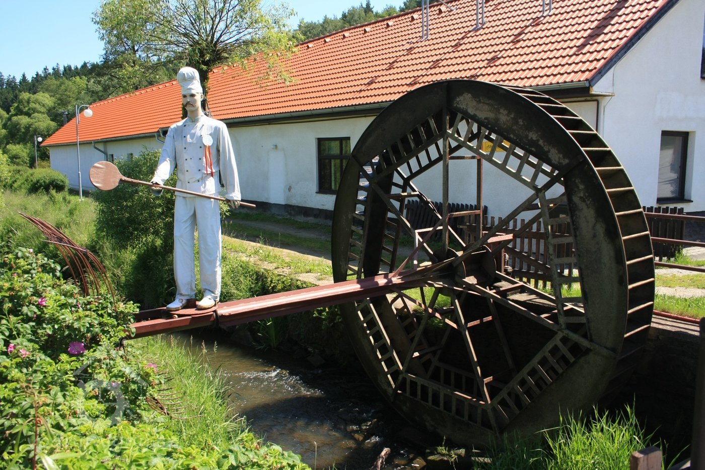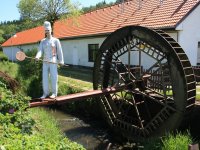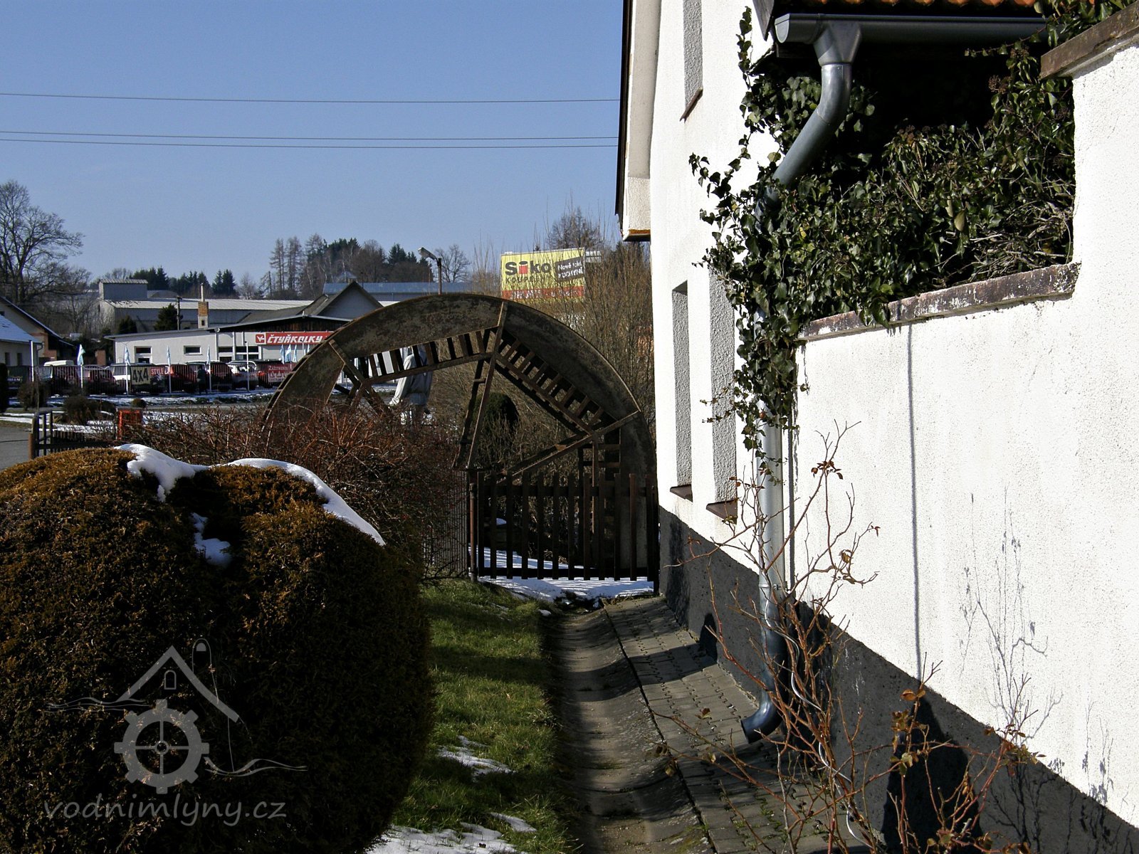 U mlýna stojí vodní kolo na spodní vodu. Jde o atrapu, která slouží jako reklamní poutač.