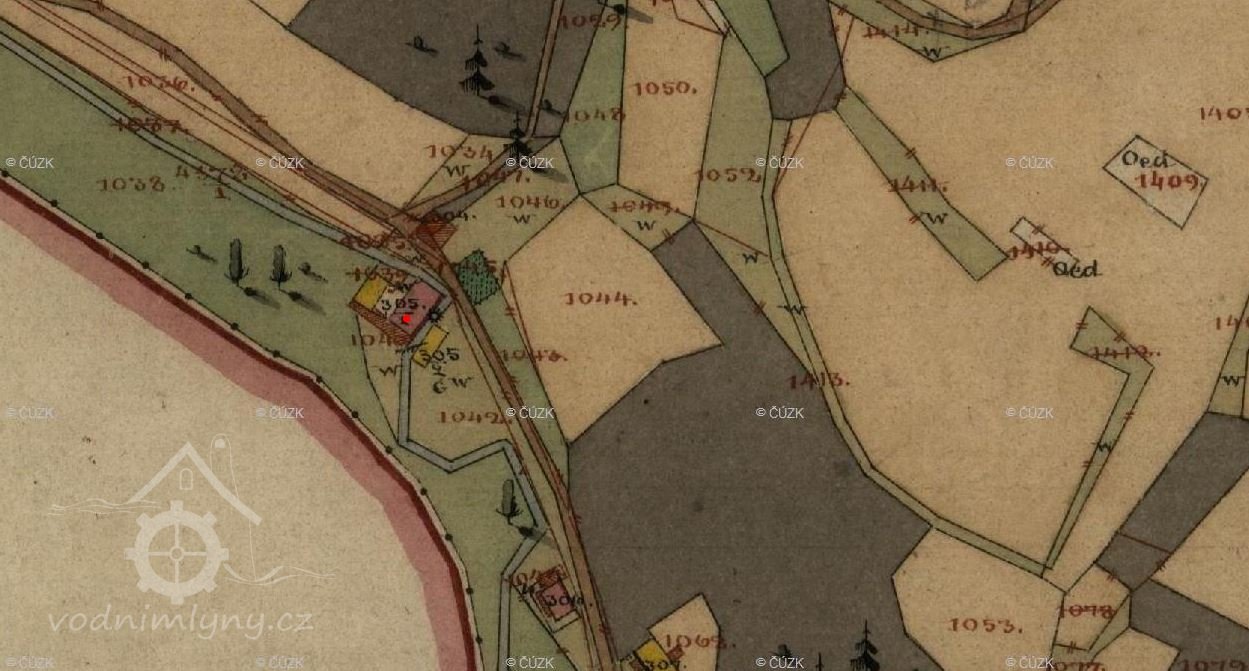 Roku 1793 je majitelem tohoto mlýna Josef Fric, který povinen byl vrchnosti odsypávati každoročně 89 a tři čtvtě měřice žita a 120 kusů kmenů na prkna pořezati. Za to obdržel od hraběnky Marie Rebeky z Hohenembsu, provdané z Harrachů povolení, že může mimo pily ještě třetí složení zříditi a k tomu potřebné místo z panského gruntu použíti za roční poplatek 30 krejcarů a bude povinen tu cestu podle jalového potoka v dobrém stavu držeti a taras na vlastní svůj náklad stavěti.