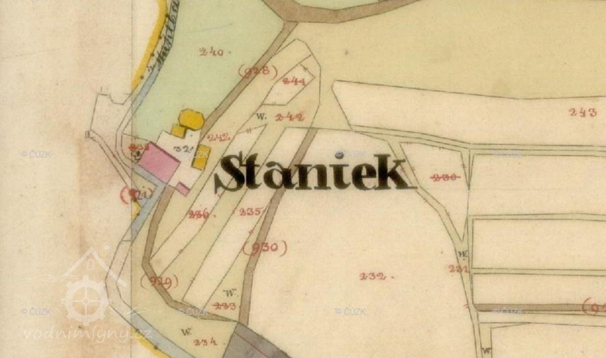 Staňkův mlýn je matrikami doložen v r.1642 a uveden v Seznamu vodních děl Republiky československé z r.1932.