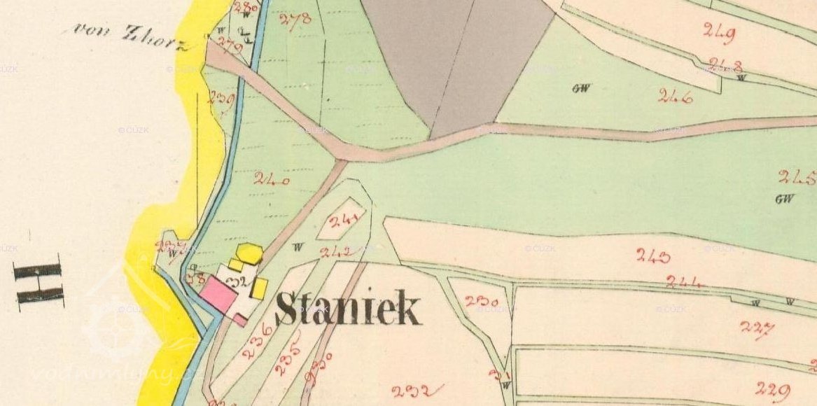 Léta Páně 1600 ve středu po [pa]mátce svatých Filipa a Jakuba [1600, 3. květen] Jiřík Černej a Jakub Mikeš, sousedé ze vsi Zhořce, též Stanislav Mynář[!] pode Zhořcem, vysvědčení učinili před osobami radními...........  Je velmi pravděpodobné, že mlýn dostal název právě po tomto Stanislavovi (Gib)