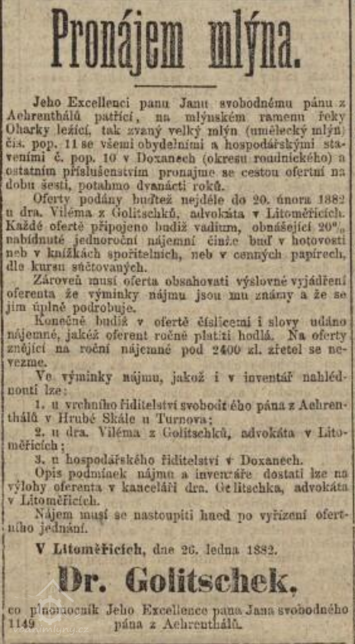 Doksany o nároku na vodu. Soudní jední trvalo 80 let. Zajímavé je, že zařízení mlýnice se používalo beze změn až do konce 18. století.