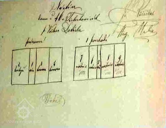 Místo tohoto normálního znamení jest od prvního sloupu stavidla na levé straně spojení jezu s břehem ke mlýnu 12 sáhů vzdáleno od břehu horní vody 4 sáhy 2 stopy a od rohu kamenné terasy na spodní vodě 2 sáhy 3 stopy 6 palců vzdáleno. Kůl tento byl na vodní ploše 6 1/2 palce do čtverce přisekán a měděnou deskou obložen, ketrá na každíé straně měděným hřebem na kůl byla připevněna, na desku samotnou položen plochý kámen a na to zemí zasypán a zapěchován byl. Tento cejchovní kůl nazančuje zřejmě výšku vodního prahu a jeho polohu, při čemž se ještě podotýká, že dva žlaby proti cejchovnímu kolu a tedy proti výšce prahu jezu o 16 3/4 palce, ostatní žlaby u mlýnské budovy však o 1 3/4 palce výše nalezeny a shledány byly.