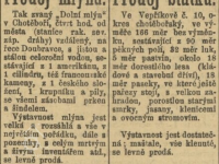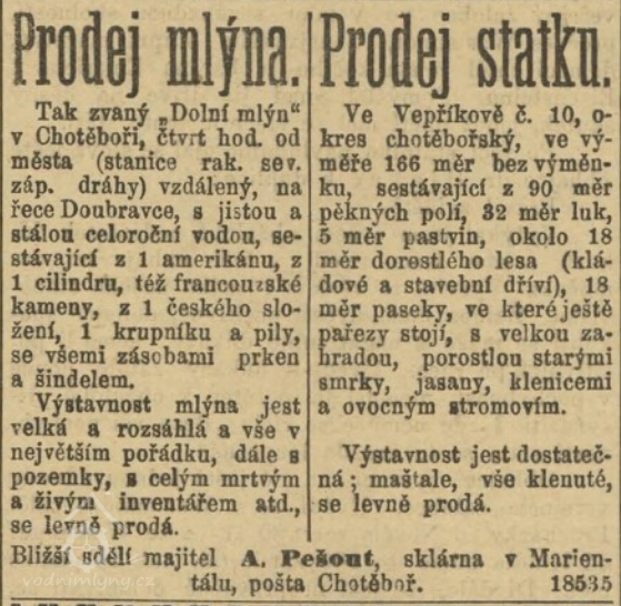 1884 - mlýn nabízen k prodeji, majitel A. Pešout. (RR)