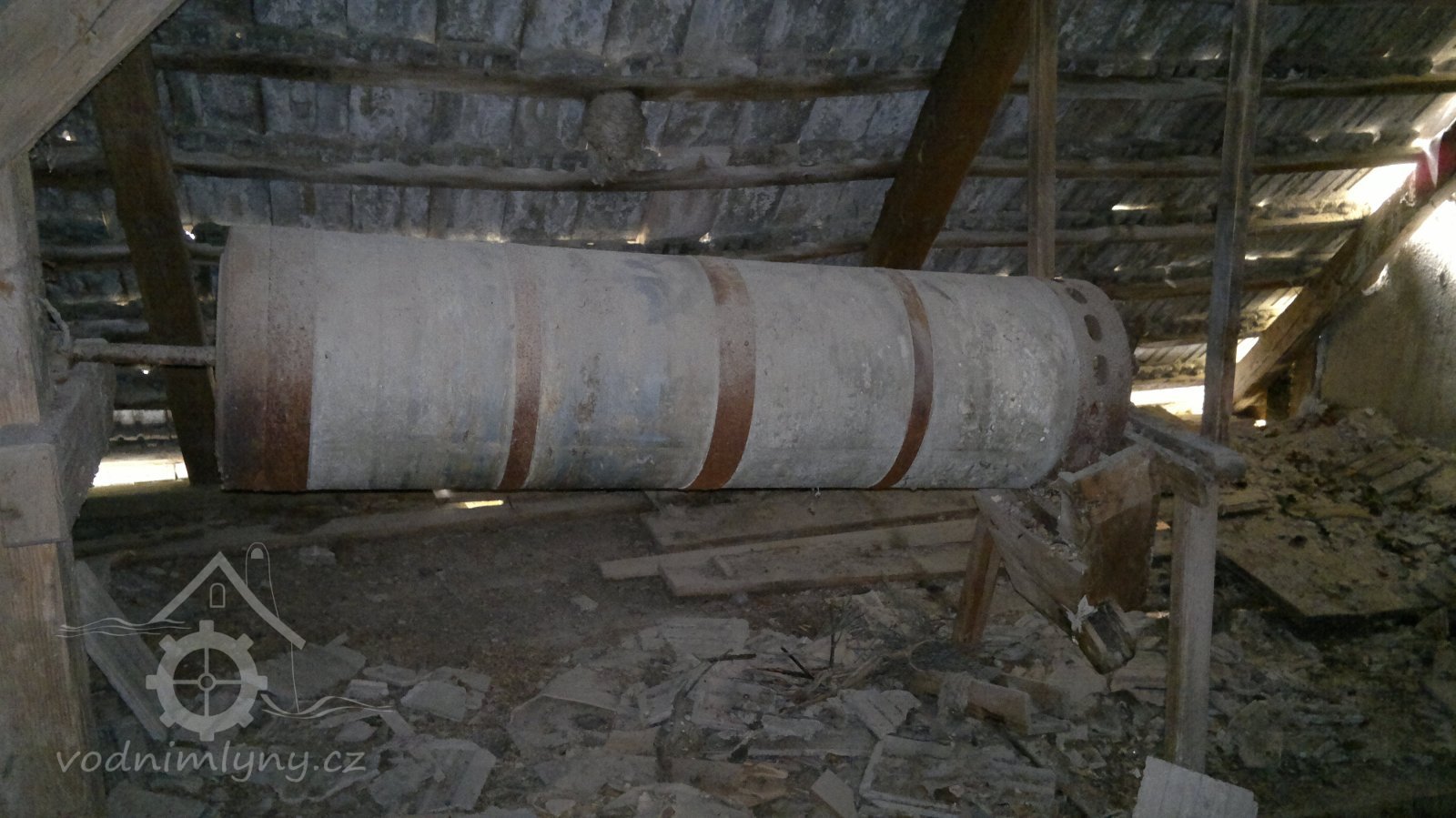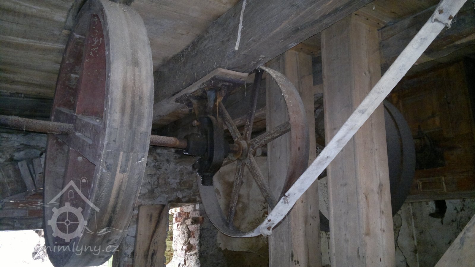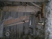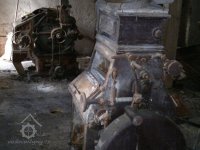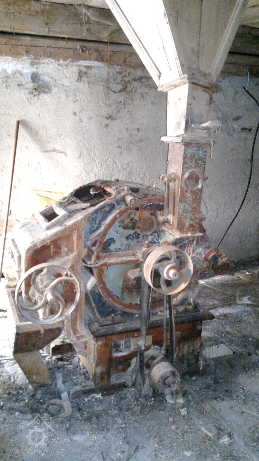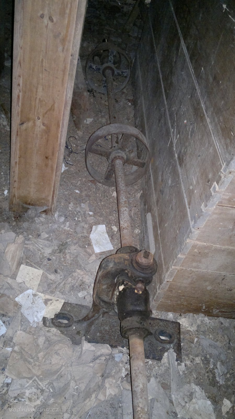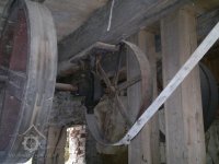 demontovaná malá transmise pod střechou, 2012, © D. Veverka, (Prvky na obrázku: transmise, řemenice, převody)
