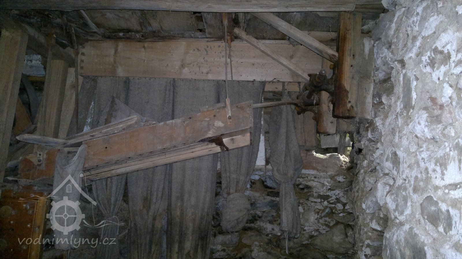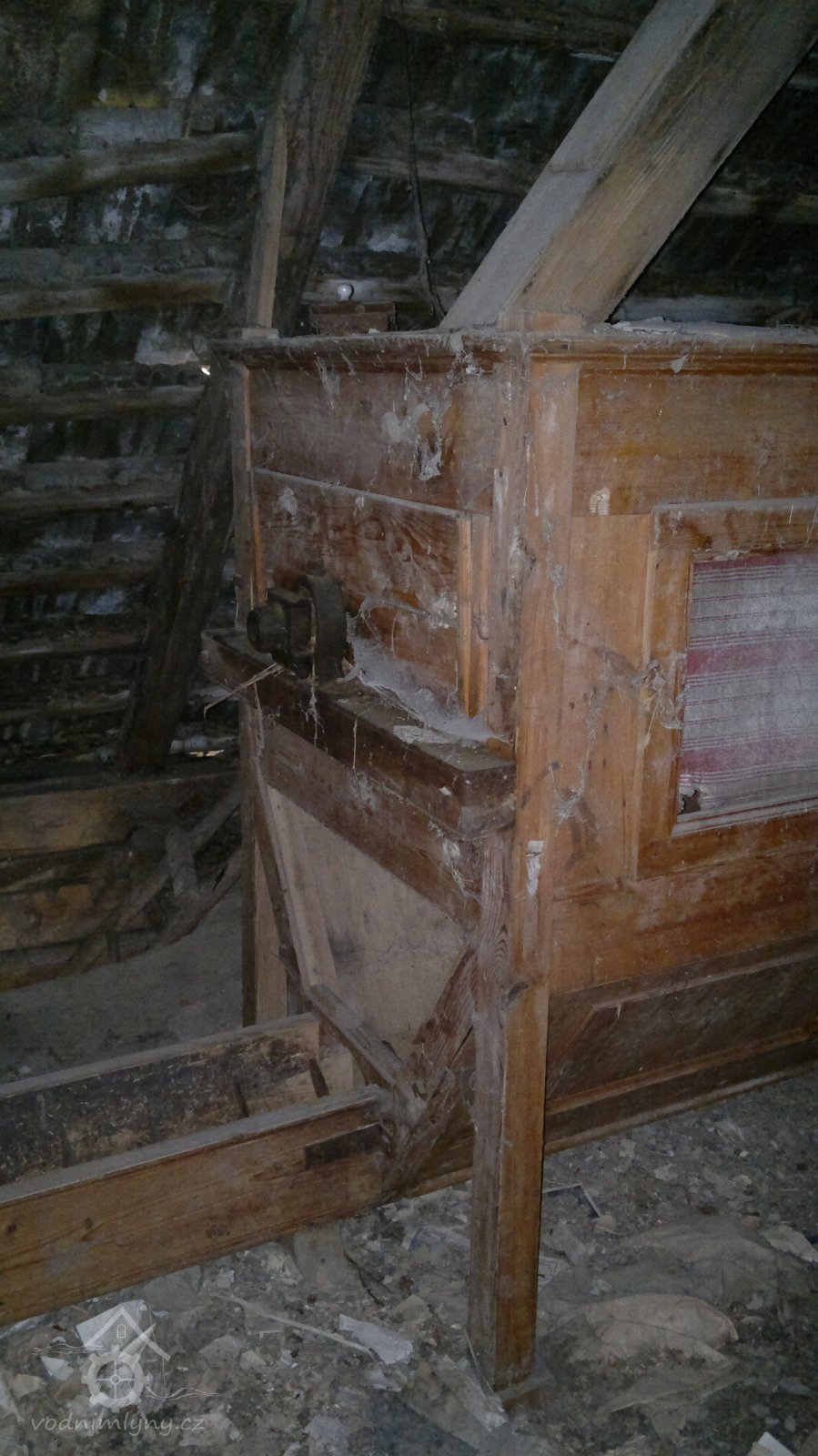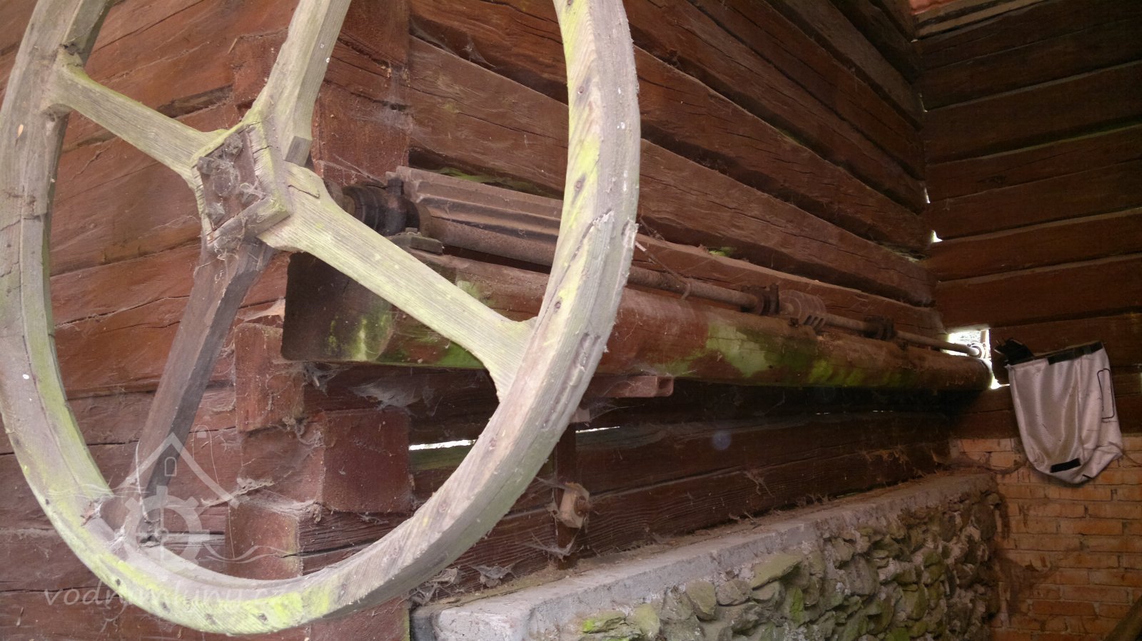 demontovaná malá transmise pod střechou, 2012, © D. Veverka, (Prvky na obrázku: transmise, řemenice, převody)