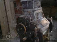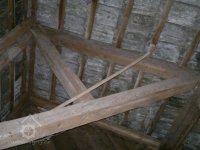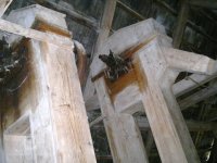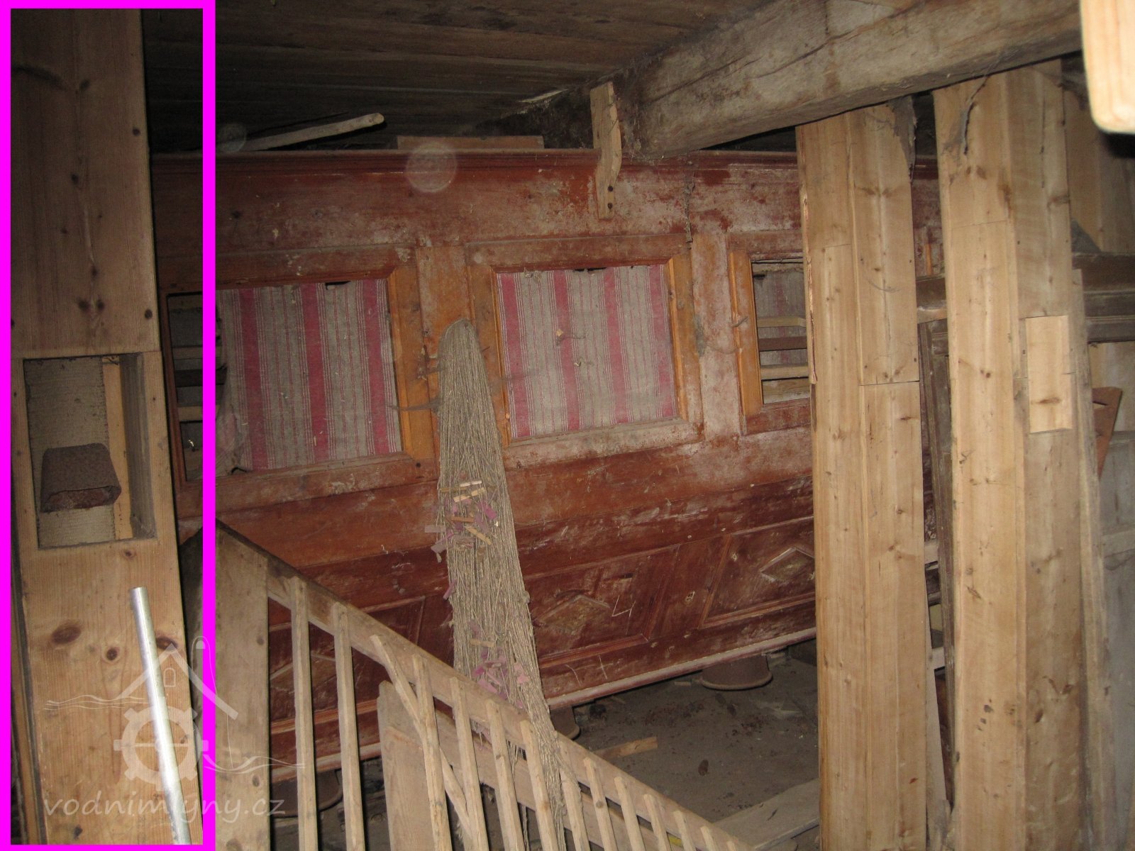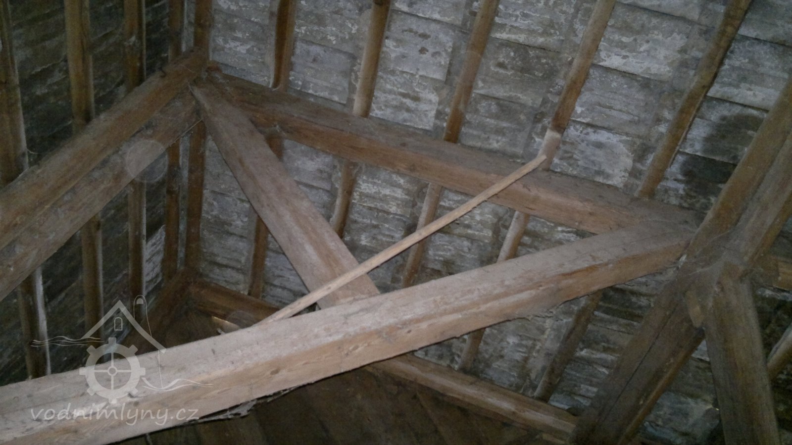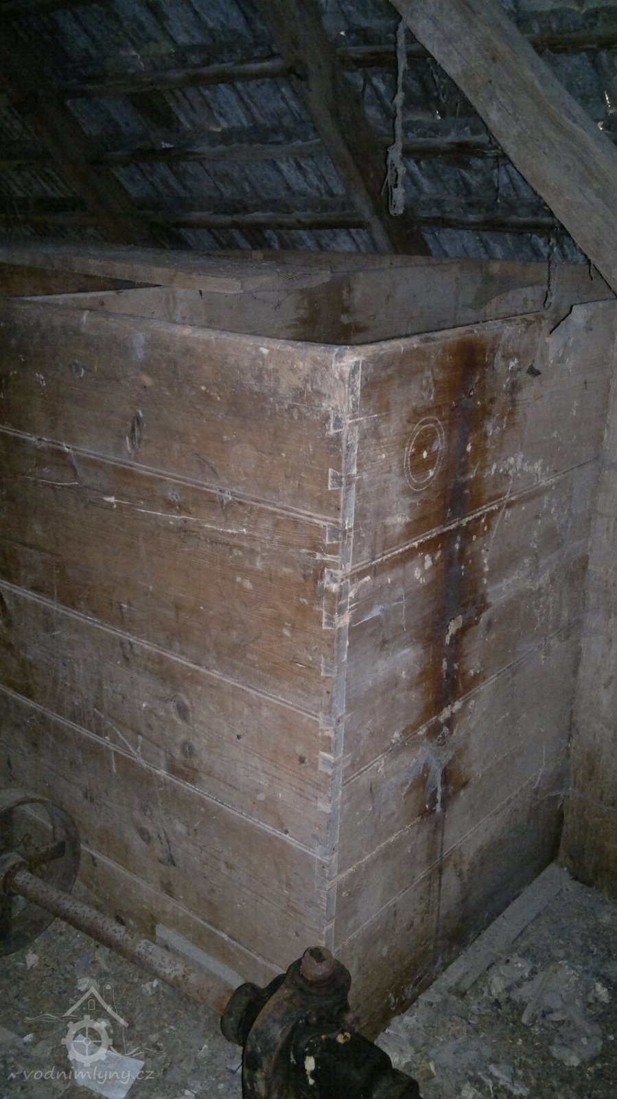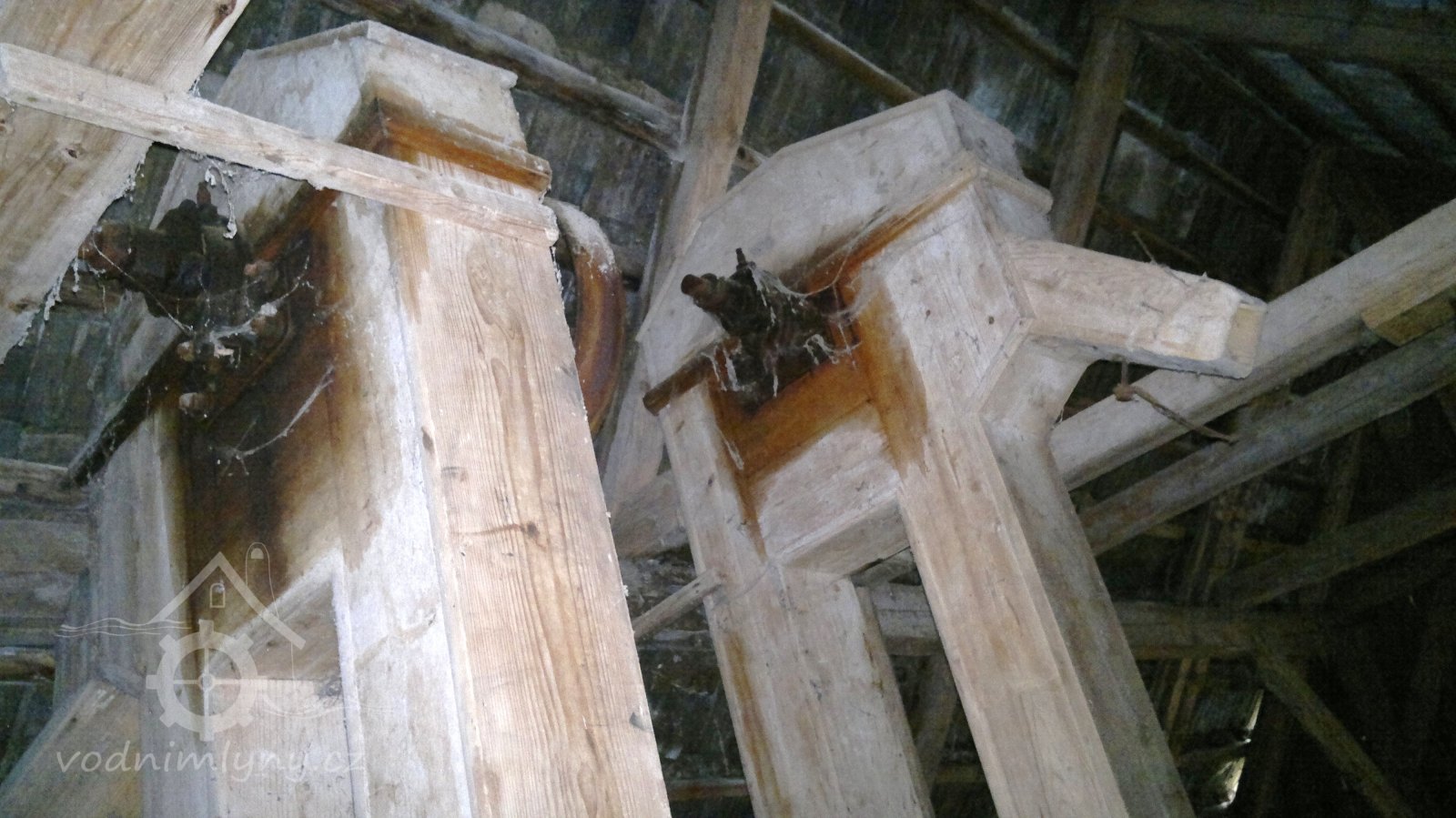demontovaná malá transmise pod střechou, 2012, © D. Veverka, (Prvky na obrázku: transmise, řemenice, převody)