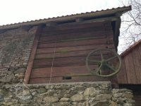 transmise ve stodole na pohon zamědělských strojů, pohon lanovým převodem od transmise mlýna, 2012, © D. Veverka, (Prvky na obrázku: transmise, řemenice, převody)