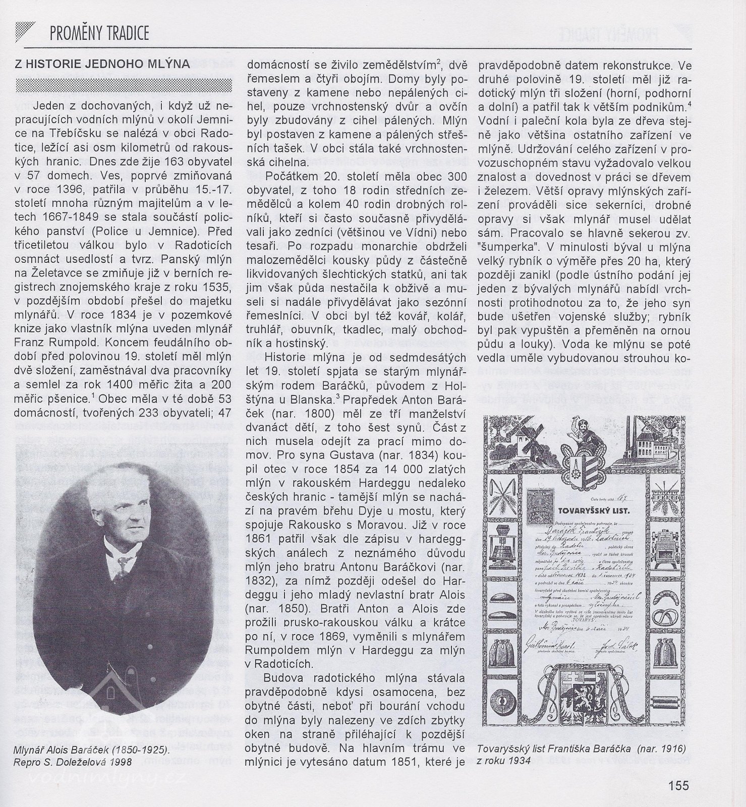Baráčkův mlýn –v letech 1843 – 1849 provedl předek rodu Baráčků, který měl mlýn v Hardeku v Rakousku výměnu mlýna s radotickým mlynářem. Mlýn měl 2 složení, 2