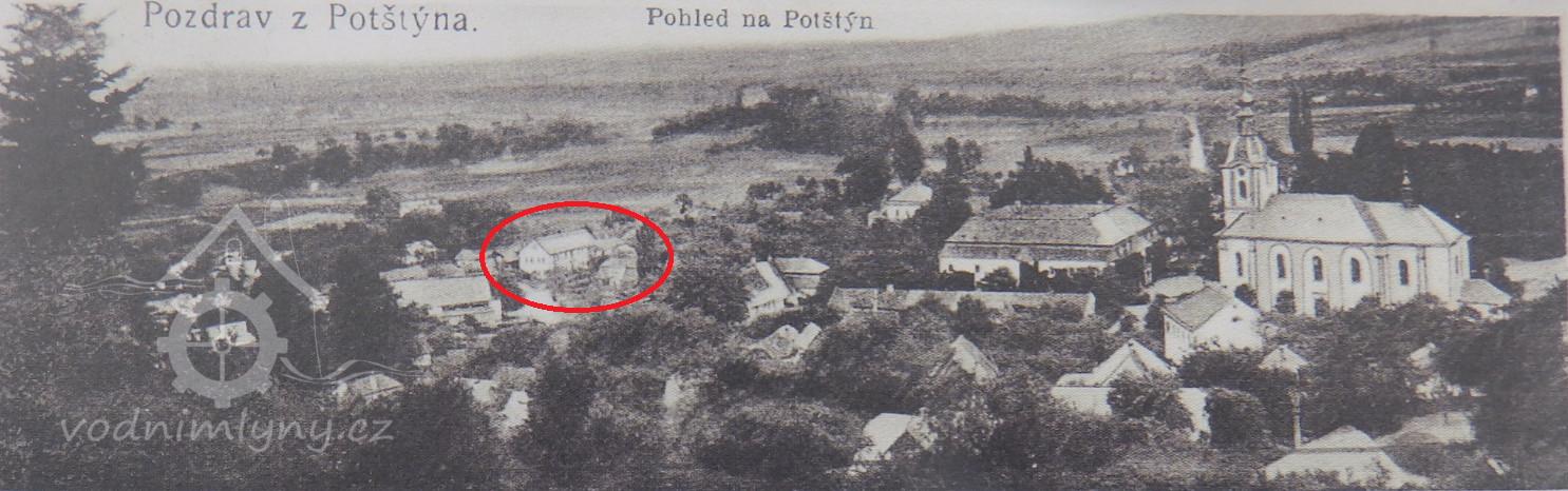 Vpravo od mostku přes náhon stával mlýn založený kolem roku 1520 v době hospodářského rozkvětu, když byl Potštejn součástí východočeské domény Pernštejnů. Koncem 19. století patřil mlýn panu Václavu Šabatovi, který na náhonu u mlýna zřídil první jednoduché „lázně“. Mlynář Šabata byl též obecním starostou a zasloužil se o výsadbu lipové aleje podél řeky. Počátkem 20. století byly ve mlýně instalovány dvě turbíny, které dodávaly elektřinu do zámku a pro veřejné osvětlení. Mlýn byl v provozu ještě ve 40. letech minulého století. Budova mlýna omezovala silniční provoz, a proto byla roku 1965 zbořena a prostranství upraveno v parčík. Připomíná ji mlýnské kolo s daty vzniku a zániku mlýna.