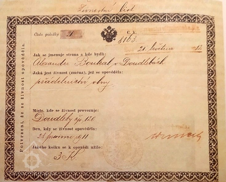 3.4.1905 Adolf předal přádelnu dětem Josefu, Václavovi, Františkovi a Anně provd. Kaufmanové.