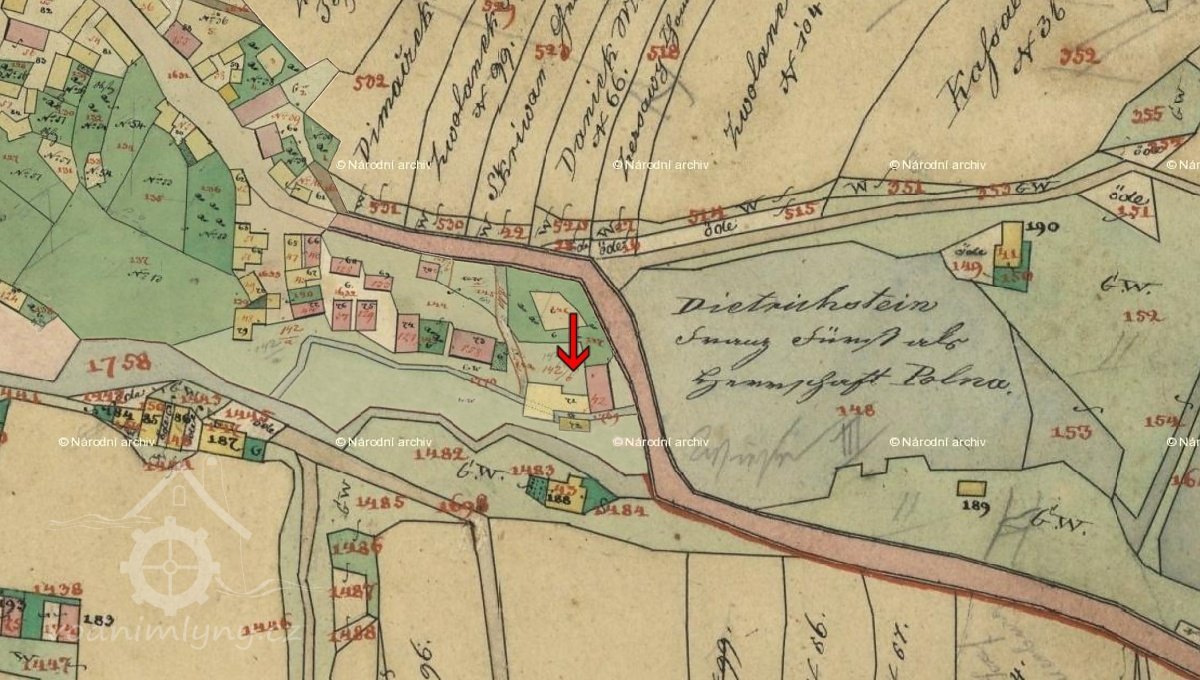 1.7.1757 Jan Březina mlýn emfyteuticky odkoupil za 100 zl., roční činže nezměněna (12 zl. 24 korců žita), užívá 6 korců desátkového pole a louku na fůru sena.