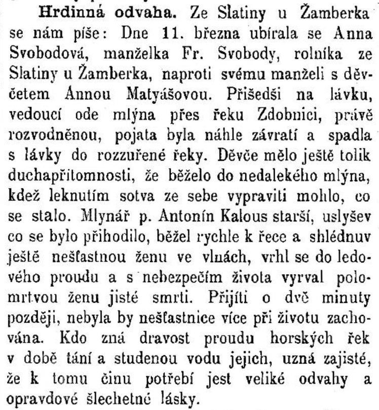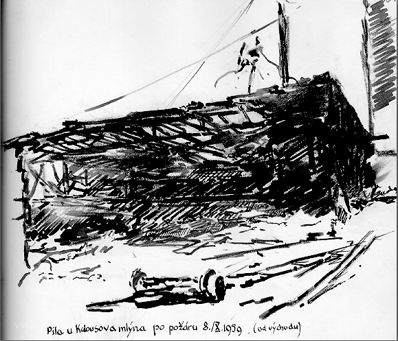 Požár pily: Byl teplý podzimní říjnový den, čtvrtek 8.10. Mnoho lidí bylo v práci na polích. Odpoledne ve 14.45 hod. se ozval náhle v místním rozhlase známý vzrušující signál - hoří - hoří - a hlasatelka oznamuje, že hoří pila u Kalousova mlýna. Pila nebyla v provozu, jen občas bylo povoleno místnímu JZD řezat zde prkna na stavbu. Parního kotle bylo v té době používáno k paření brambor na siláž. Tento úkol plnil František Ulrych z č.p. 204. Toho dne začal vařit první dávku. O vzniku požáru uvádí: "Zaslechl jsem podezřelý praskot. Pátral jsem tedy po příčině a zjistil jsem, že strop v okolí komína začíná doutnat. Použil jsem hned hasícího přístroje, ale bez úspěchu. Oheň vznikl uvnitř dvojitého stropu, jímž plechový komín procházel. Na můj poplach přispěchal vedoucí mlýna Bohuslav Vozka rovněž s hasícími přístroji, ale ani jemu se nepodařilo oheň uhasit. Volali jsme proto telefonicky do kanceláře JZD a na poštu. Sám jsem sedl na motocykl a jel do hasičské zbrojnice pro motorovou stříkačku. Cestou jsem svolával pomoc."