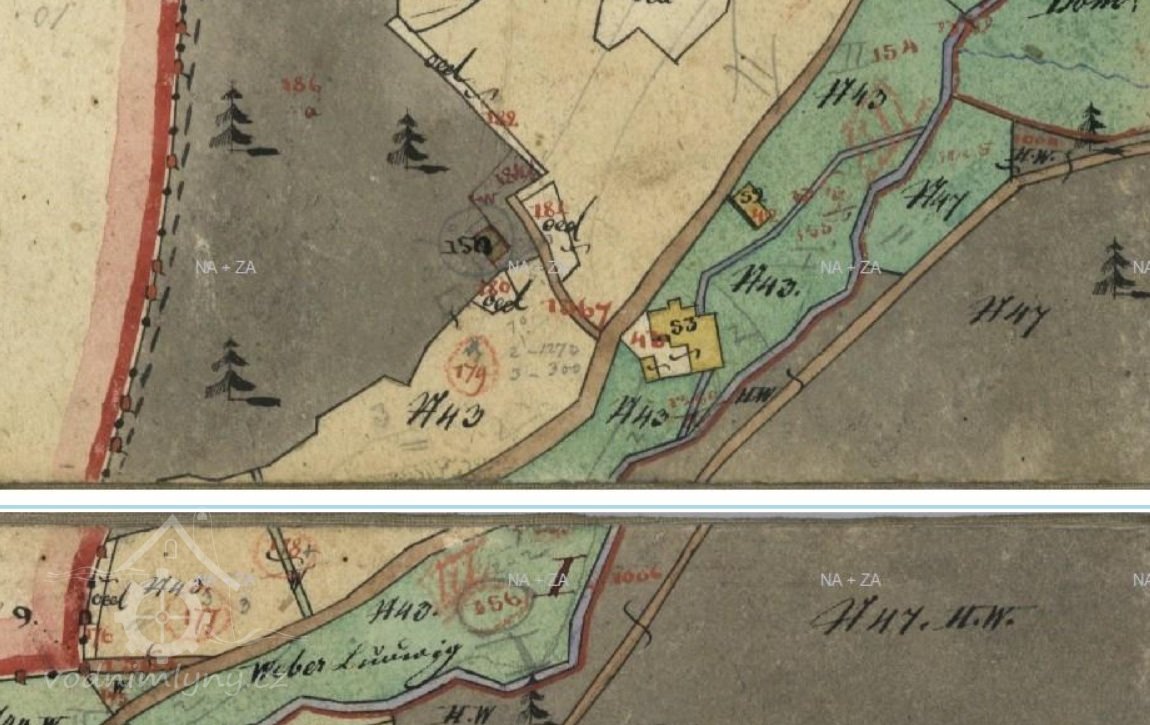 1856: Ludwig Weber besitzt 193 Klafter Bauareal, 4 Joch 925 Klafter Äcker,