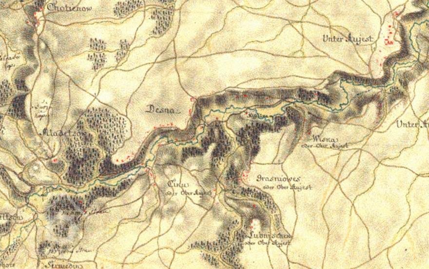 Z doby Marie Terezie, kdy se provádělo tzv. první vojenské mapování, pochází následující popis zdejší krajiny a mlýna: "Víska, neboli Horní Újezd, je rozložena po stráních příkré rokle, která se pod vesnicí svažuje do údolí, jímž protéká Desná. Většina domů je vystavěna z kamene a obehnána ochrannou zdí. Pouze mlýn Kysilkův a mlýn ve vesnici jsou zděné jen způli. Přes mlýnské náhony vedou dřevěné mosty. Údolí se dá projet pouze po cestě, která jím podél prochází."