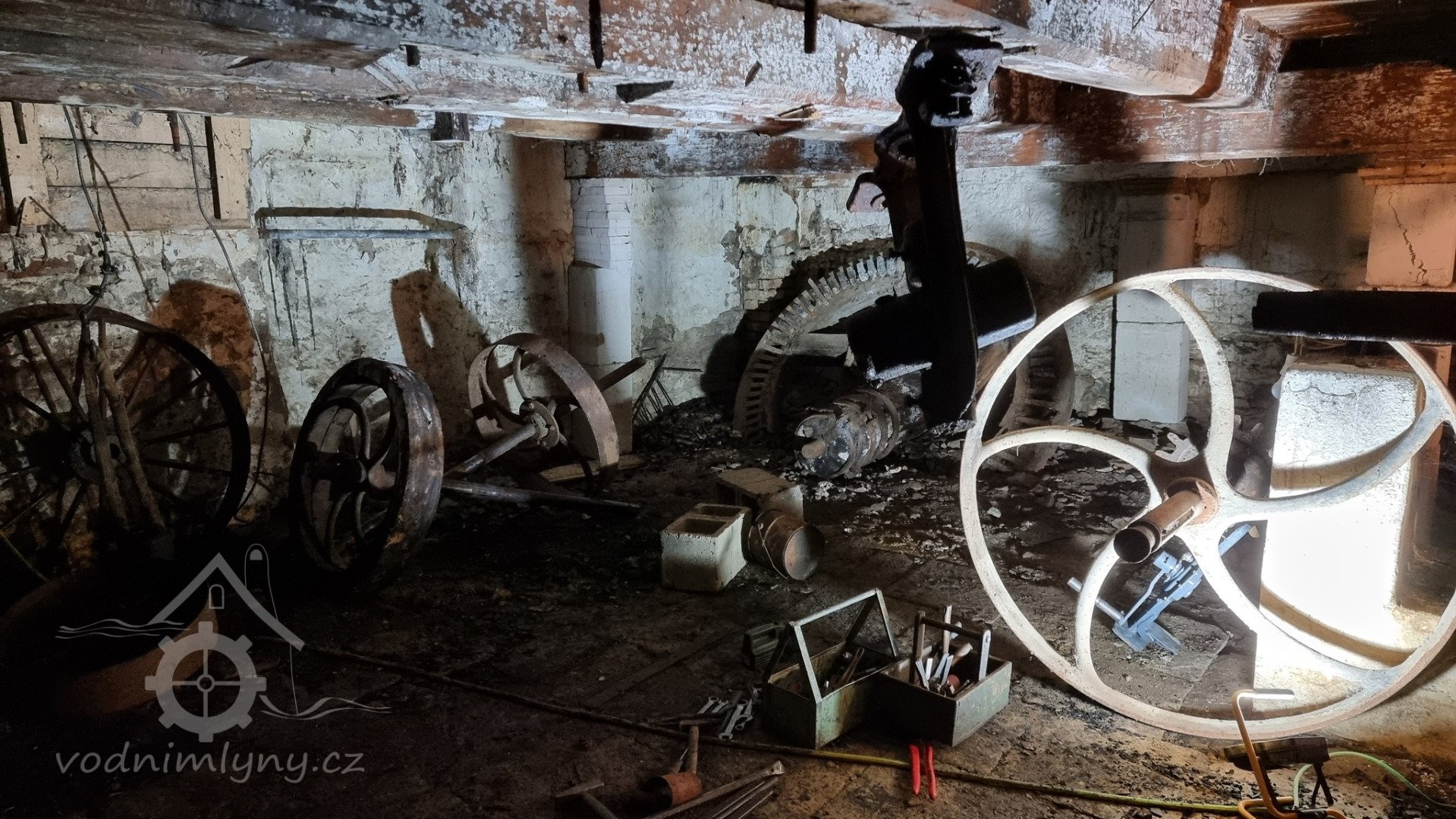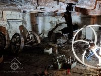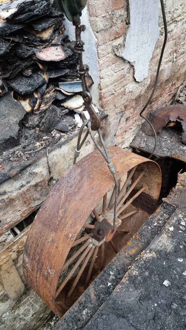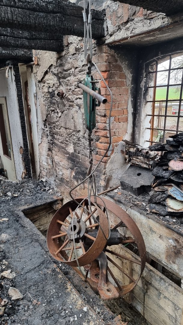 Podkolí po požáru, 01 2023, © Dušan Veverka, (Prvky na obrázku: transmise, řemenice, převody - paleční kola, pastorky a cévníky (řemeslný výrobek), transmise, řemenice, převody - transmisní hřídele s řemenicemi (výrobek průmyslový i řemeslný))