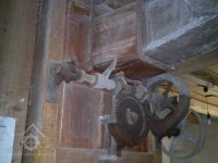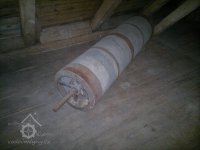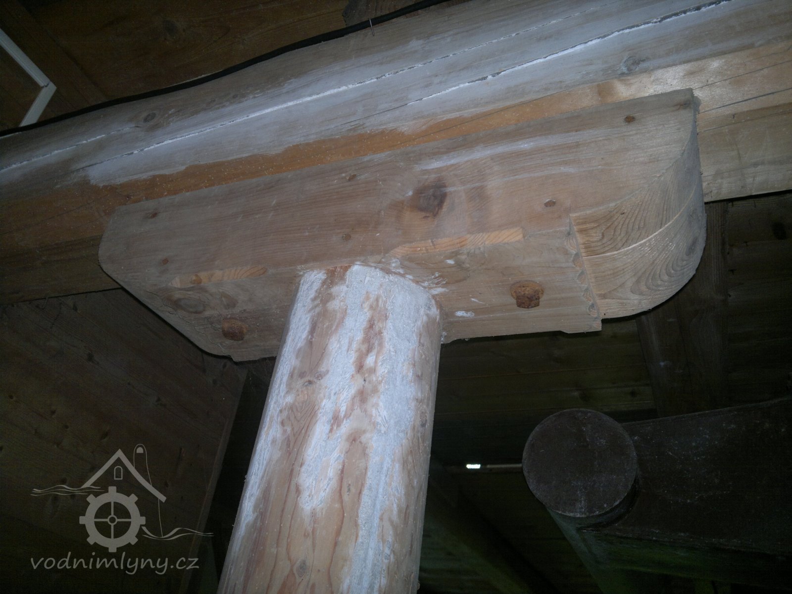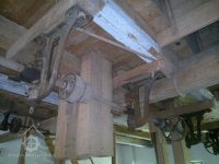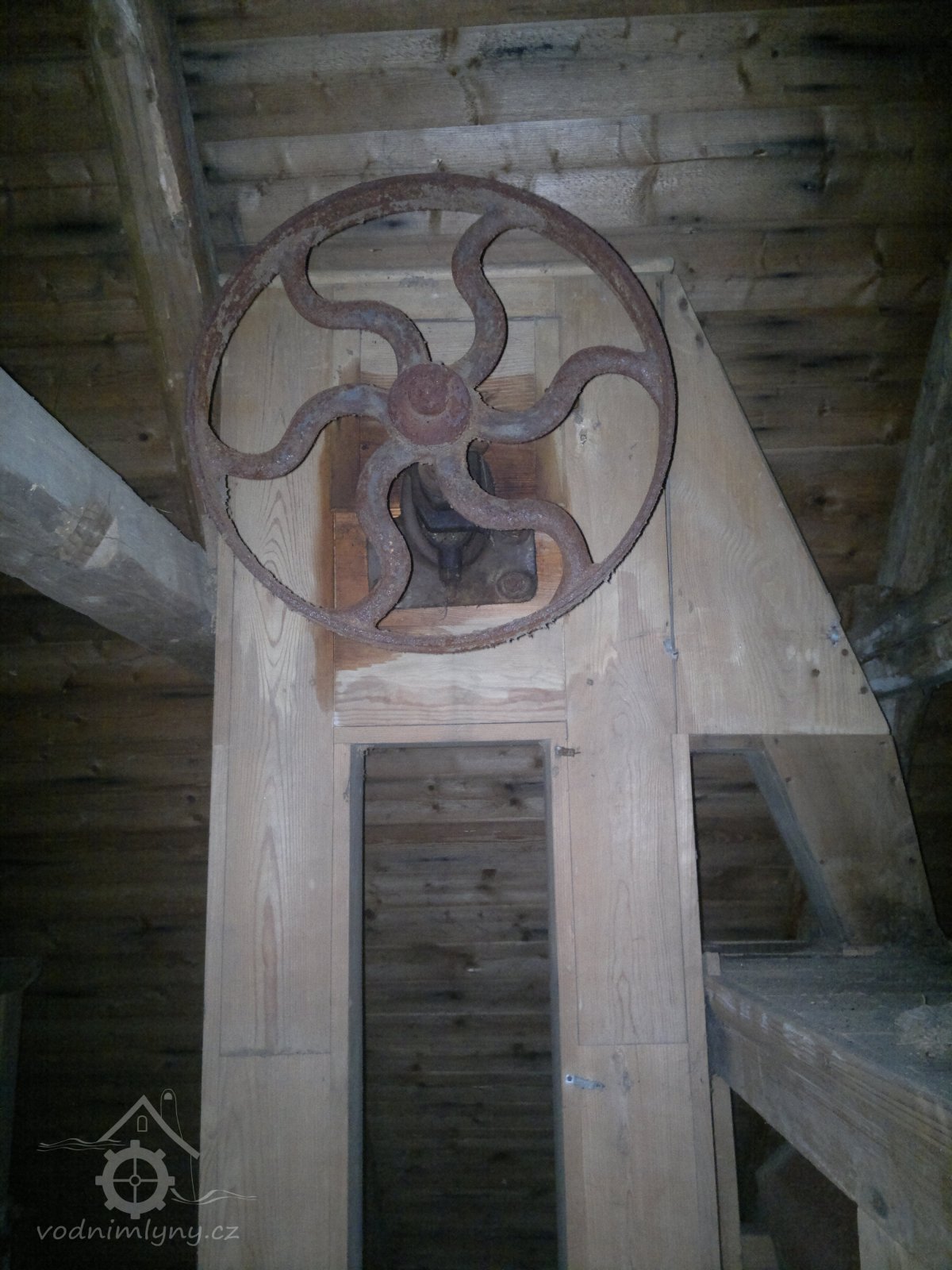 hlava jednoho z kapsových dopravníků v podstřeší s řemenicí z konce 19. stol., 2012, © David Veverka, (Prvky na obrázku: výtahy a dopravníky)