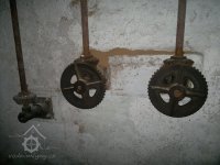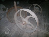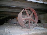 demontovaná transmise v podstřeší, 2012, © David Veverka, (Prvky na obrázku: transmise, řemenice, převody)