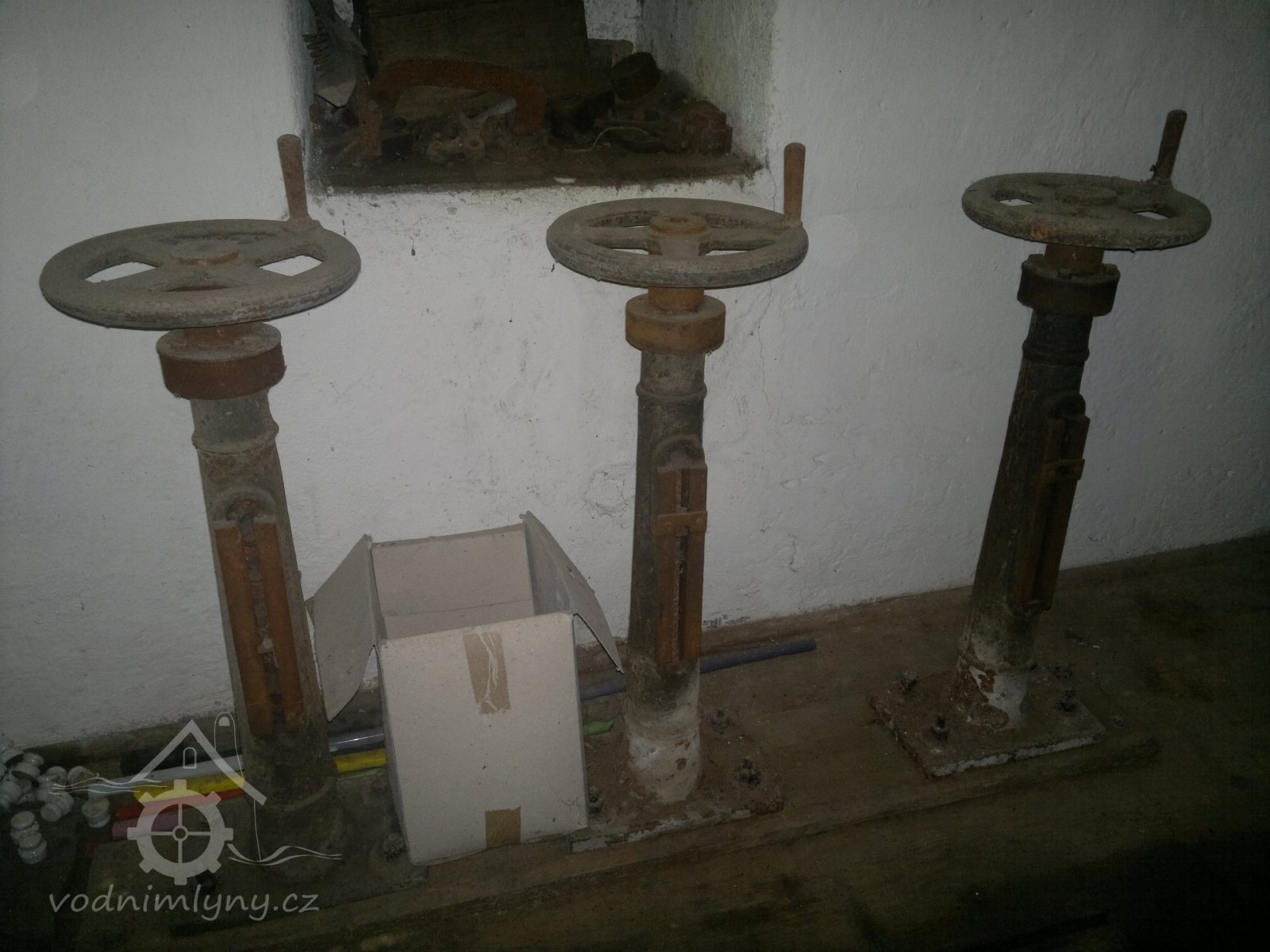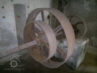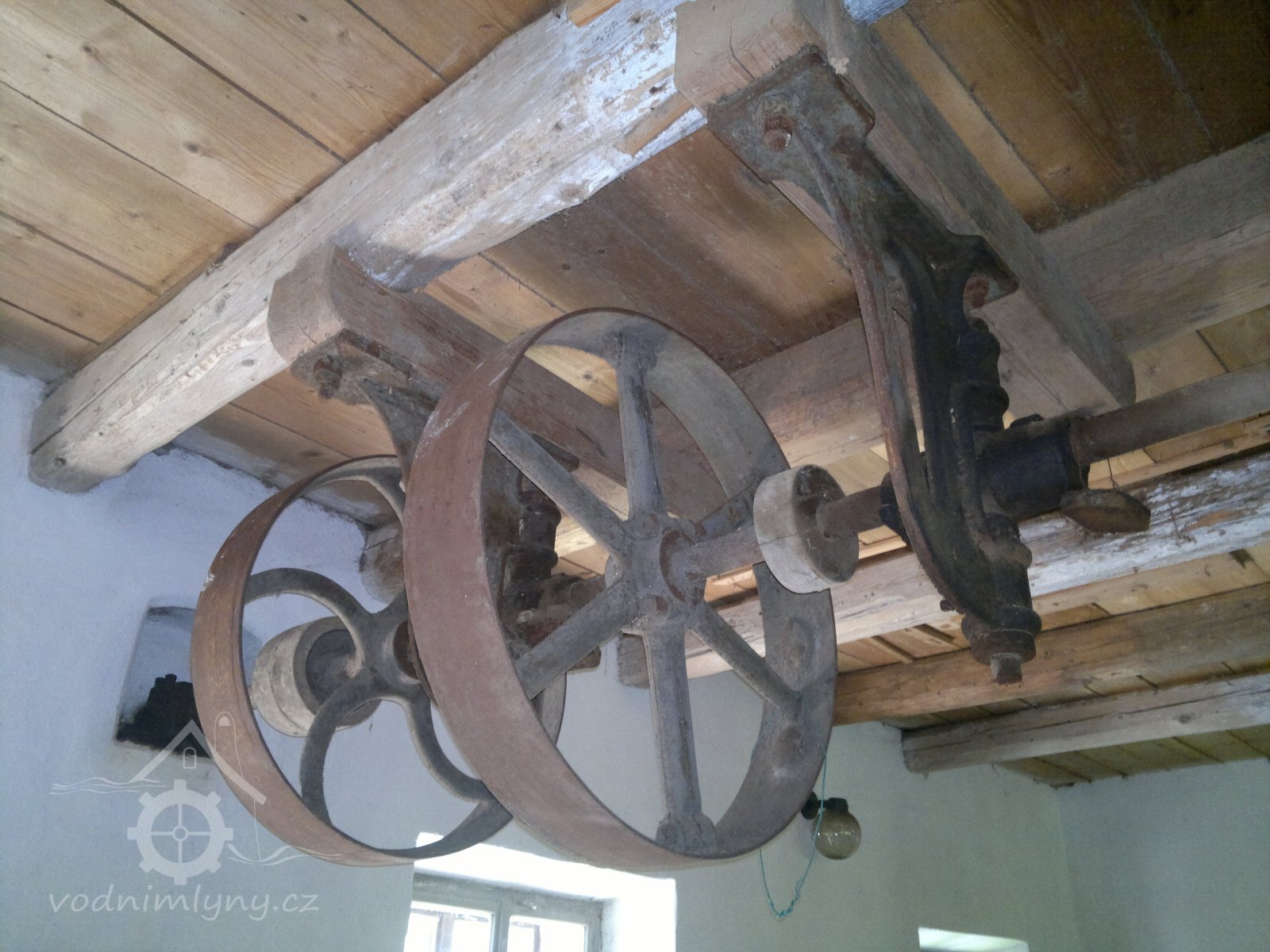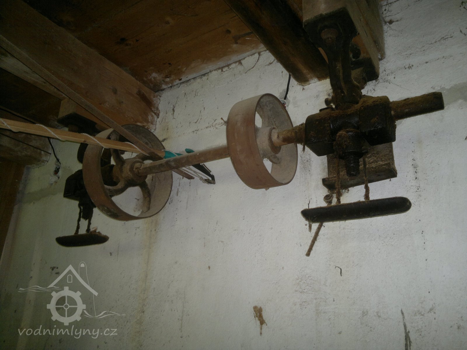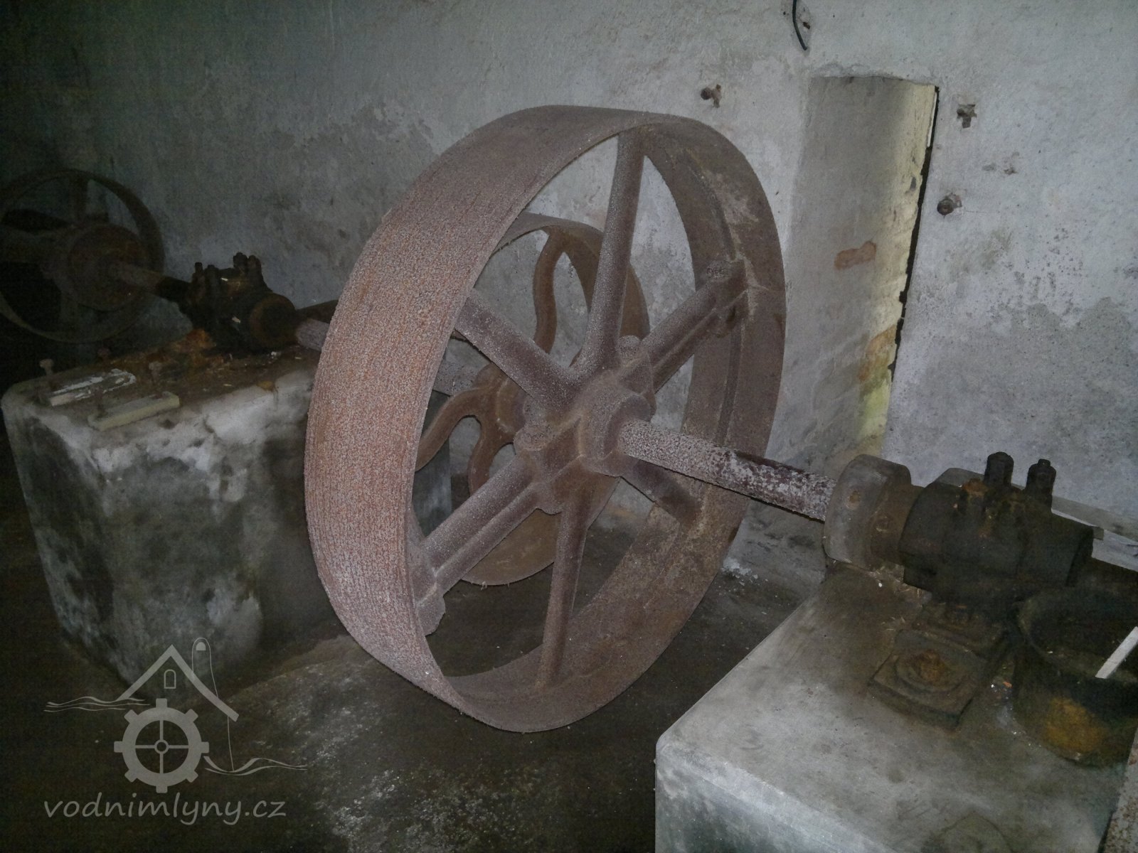 hlavní hnací transmise v podkolí mlýna, 2012, © David Veverka, (Prvky na obrázku: transmise, řemenice, převody)