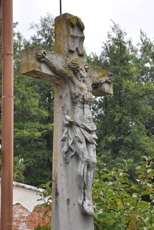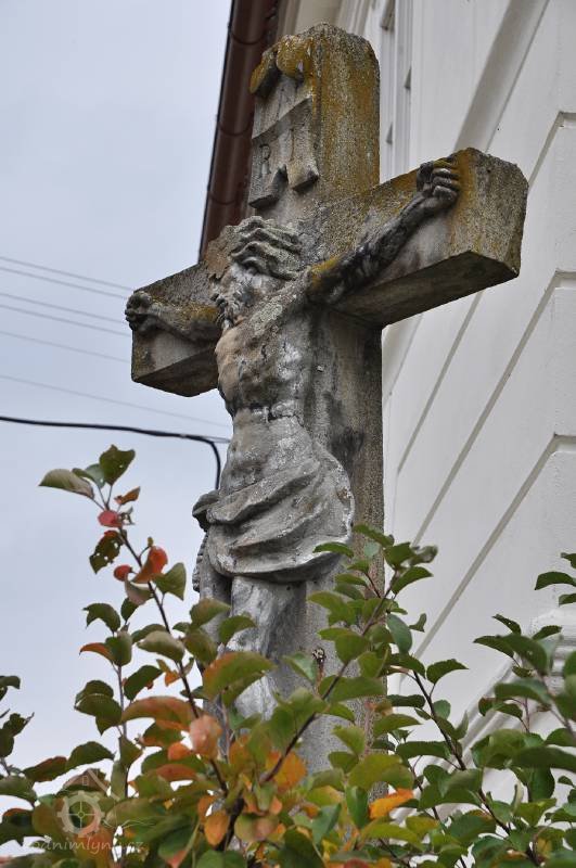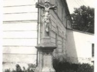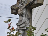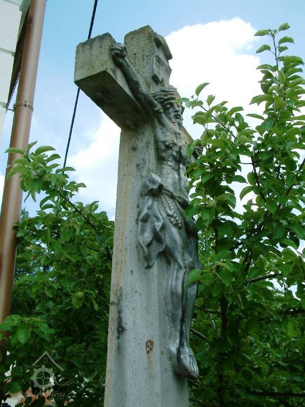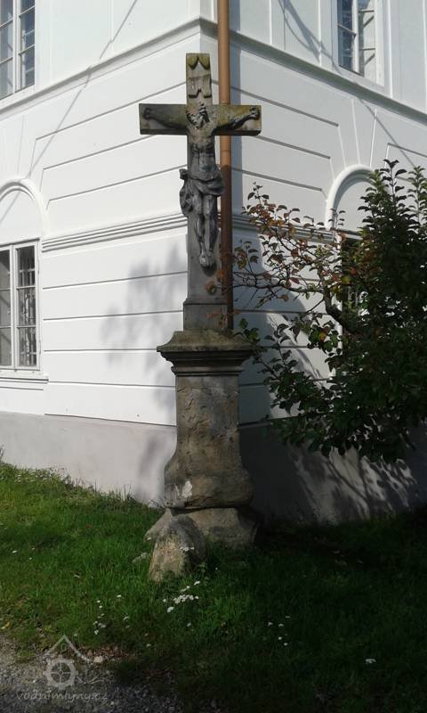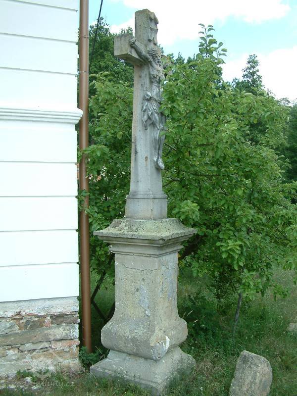 V rámu špatně čitelný minuskulní nápis. Sokl ukončen silně vyloženou profilovanou římsou,, na ní patka kříže, ukončena jednoduchou římsou. Masivní kříž s pravoúhle ukončenými rameny k horní části se zužující. Tělo Kista mírně prověšeno muskulatura těla zdůrazněna, bederní rouška svázána u pravého boku. Tvář skloněna k pravému rameni v tříčtvrtečním profilu. Nad hlavou nápisová blána