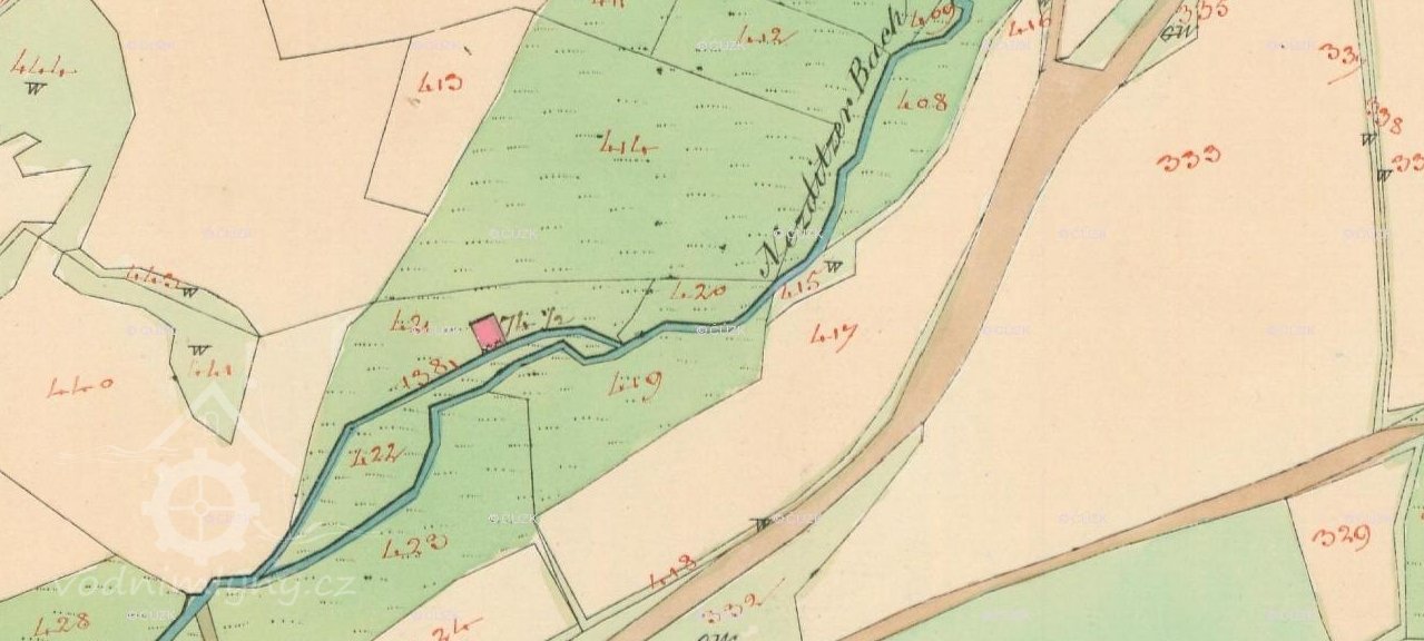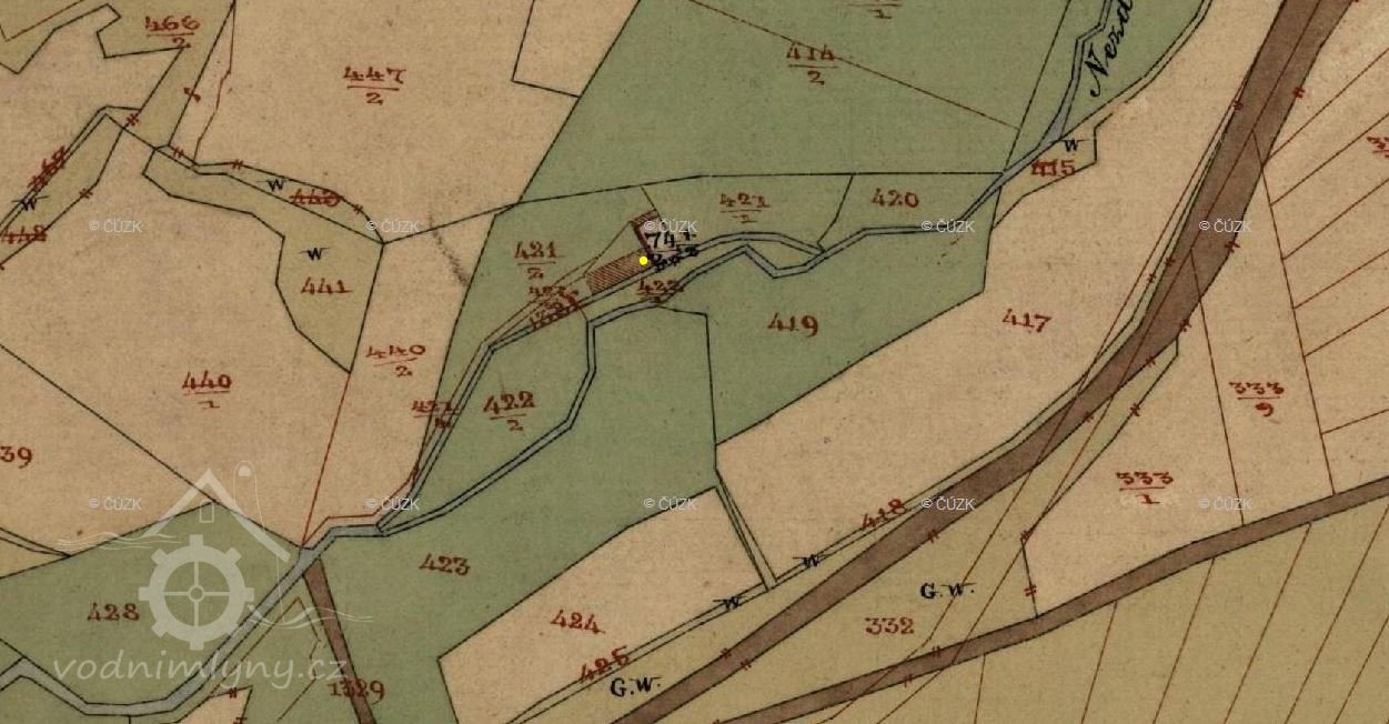 PopisV roce 1930 pohání mlýn kolo na svrchní vodu s průtokem 0.06 m3/s, spádem 4.5 m o výkonu 3 HP.