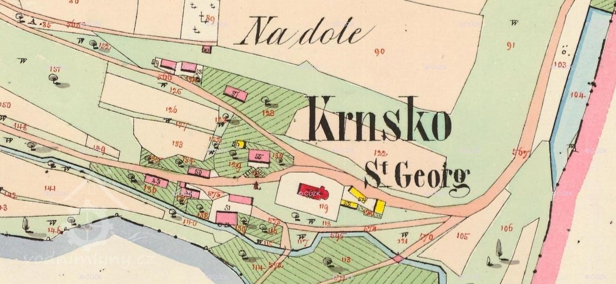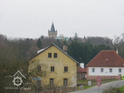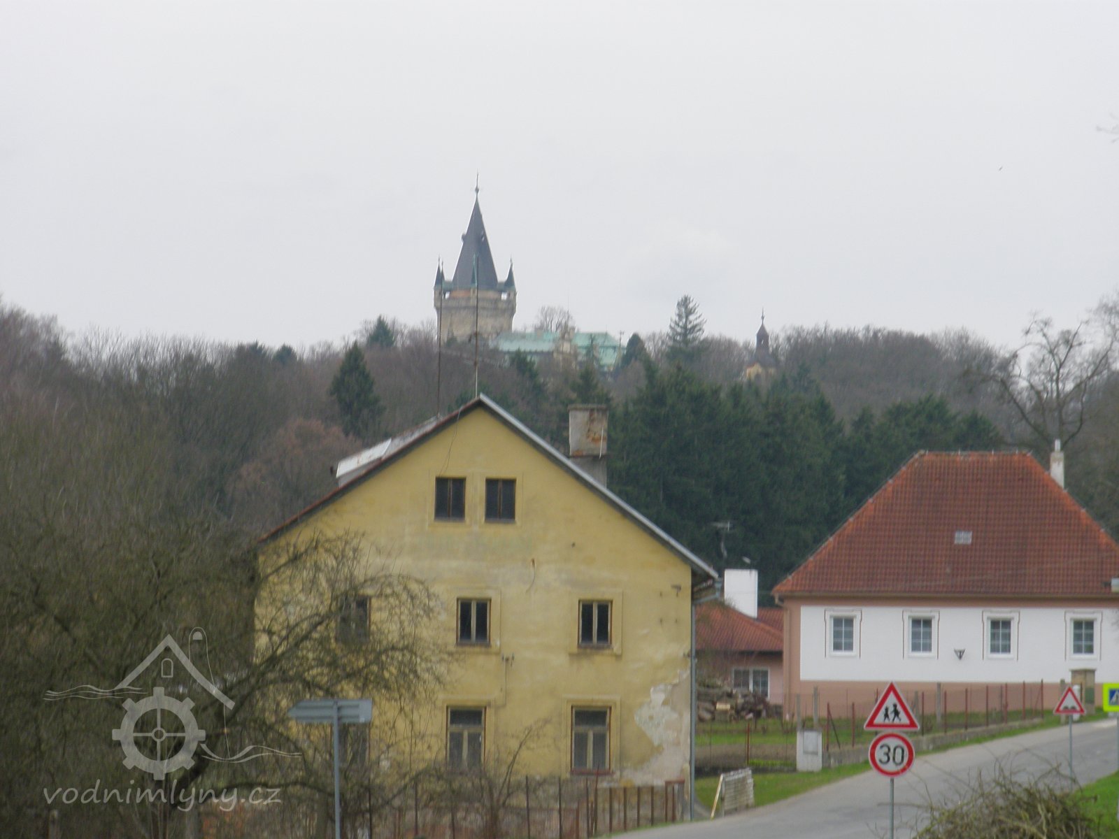 Mlýn je v obci Krnsko pod kostelem sv. Jiří. V pozadí je zámek Stránov.