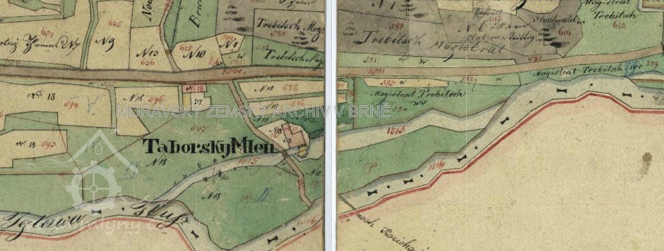 Proč název Táborský mlýn? Údajně v těchto místech se shromažďovala r.1424 husitská vojska (Táborská), než obsadila Třebíč, tak snad ústním podáním tento místní název se zachoval do současnosti. (Ve skutečnosti se nazývá podle majitele Matěje Táborského - pozn. doxa) Původně patřil mlýn mlynářské firmě Josef Dufek a synové, v provozu byl mlýn, pila a dynamo. Rozhodnutí nahradit hlavní vodní kolo - pokrokovou investicí do Francisovy turbíny, mlynáře Dufka tehdy finančně vyčerpala natolik, že v konkurenčním boji s finančně silnějším mlynářem Albrechtem Palečkem, (který měl mlýn výše proti proudu Jihlavy) tento souboj prohrál a Albrecht Paleček tento Dufkův mlýn patrně v dražbě koupil. Po roce 1930 měl mlýn dle historických pramenů Francisovu turbínu, Q 1,53m3, spád 1,85m - 26 HP (20KW). Mlynářovy dcery Helena a Věra Palečkovy, dle jejich vyprávění tehdy musely pomáhat u čištění česel turbíny. Po II.sv. válce nedoznal mlýn již výrazných investic a po zestátnění už jen chátral. Sloužil státnímu statku Jaroměřice nad Rokytnou (později název Oseva), jako sklad osiv, strojů, postřiků, materiálu a hnojiv do r.1998. Po více jak 40ti letech chátrání bylo započato s rekonstrukcí objektu turbíny, čištění náhonu a demontáž turbíny probíhala r.1994-1999, rekonstrukce budovy turbíny v r.1998. Repasi oběžného kola (nový horní a dolní těsnící prstenec) a novou hřídel původní Francisovy turbíny (Martinek-Calábek z r.1930), provedl na zakázku v r. 2001 Sanborn a.s. Velké Meziříčí. Byly rovněž v Brněnské slévárně Roučka a.s. odlity nové litinové klapky rozváděcího kola. V současné době MVE vlastní a provozuje firma Syrový Jan z Třebíče. Jez Táborského mlýna a vtok do mlýnského náhonu je v ř.km 93,706, zaústění náhonu-odpadu do řeky Jihlavy je v ř.km 93,400.