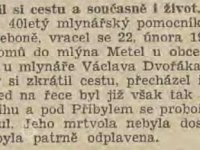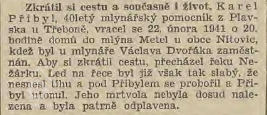 Utonulý Karel Přibyl. Od pana Hešíka jsem dostal tip na smutný osud Karla Přibyla, který se nešťastnou náhodou utopil na Meteli a byl nalezen náhodou jeho synem až v Hamru. Kronika Valu udává, že se utopil v roce 1940 a byl nalezen až za rok a půl. Více reálný mi připadá zápis z novin, utopil se v roce 1941 a za půl roku byl nalezen v Hamru. Tak či tak smutný příběh