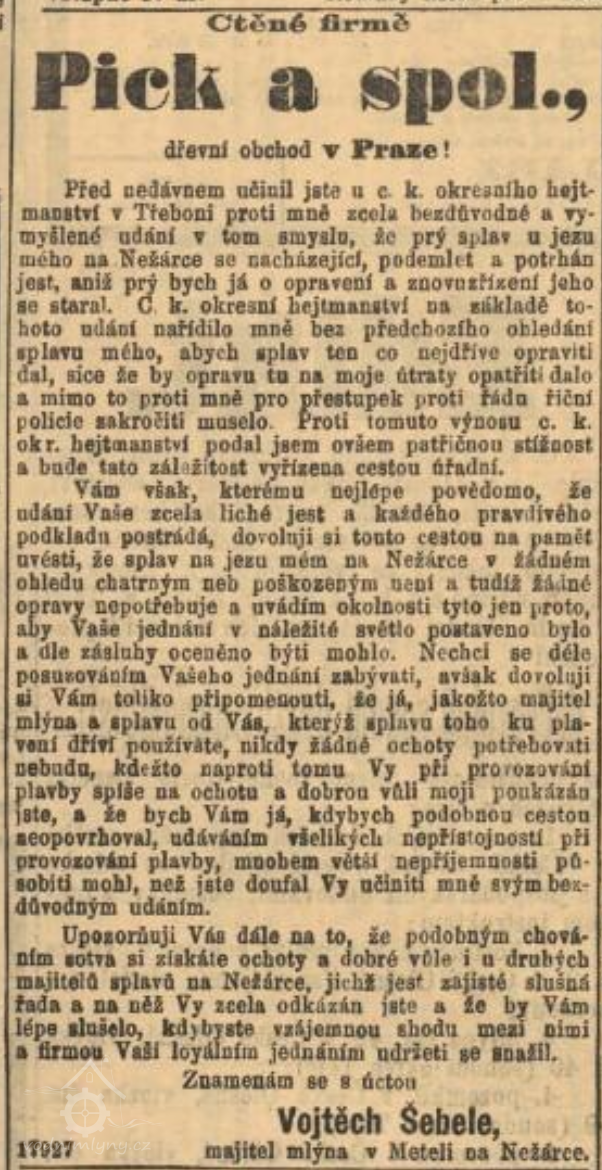 koupil Josef Šedivý ze mlýna v Orlických Zlákovicích s manž Annou, dcerou Karla Votruby ze mlýna Rytíř u Svinek