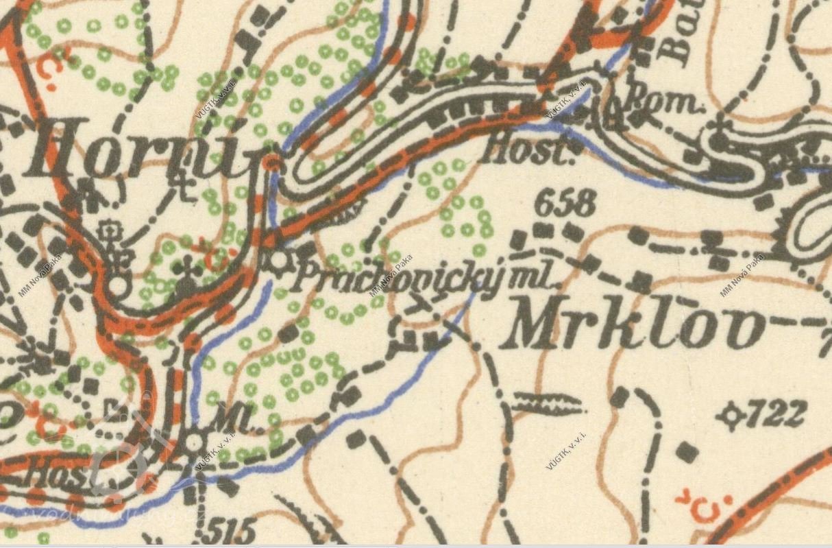 Nejbližší okolí mlýna se dnes nazývá Prakovice a mlýn v malém údolíčku je tak znám především pod tímto názvem jako Prakovický. Údajně je to proto, že se kdysi ve stráni nacházela c.k. prachárna, která explodovala po zásahu bleskem. Proto se dnes často setkáváme i s místopisným ekvivalentem Prachovice.