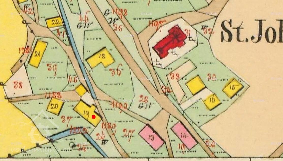 Původní č. p. bylo 38 (kat. č. 19). To ale není totožné s dnešním č. p. 38, které se nachází opodál.