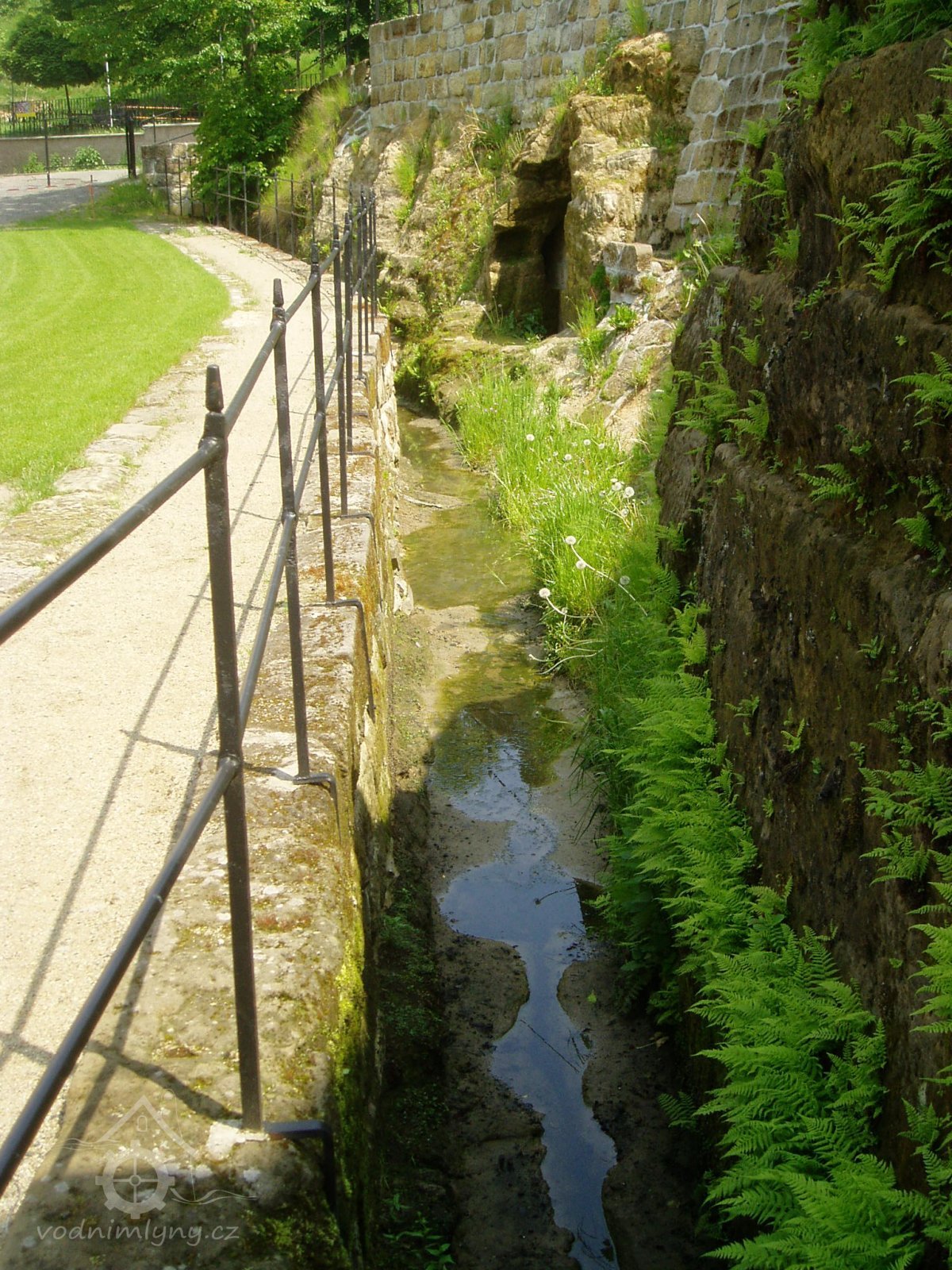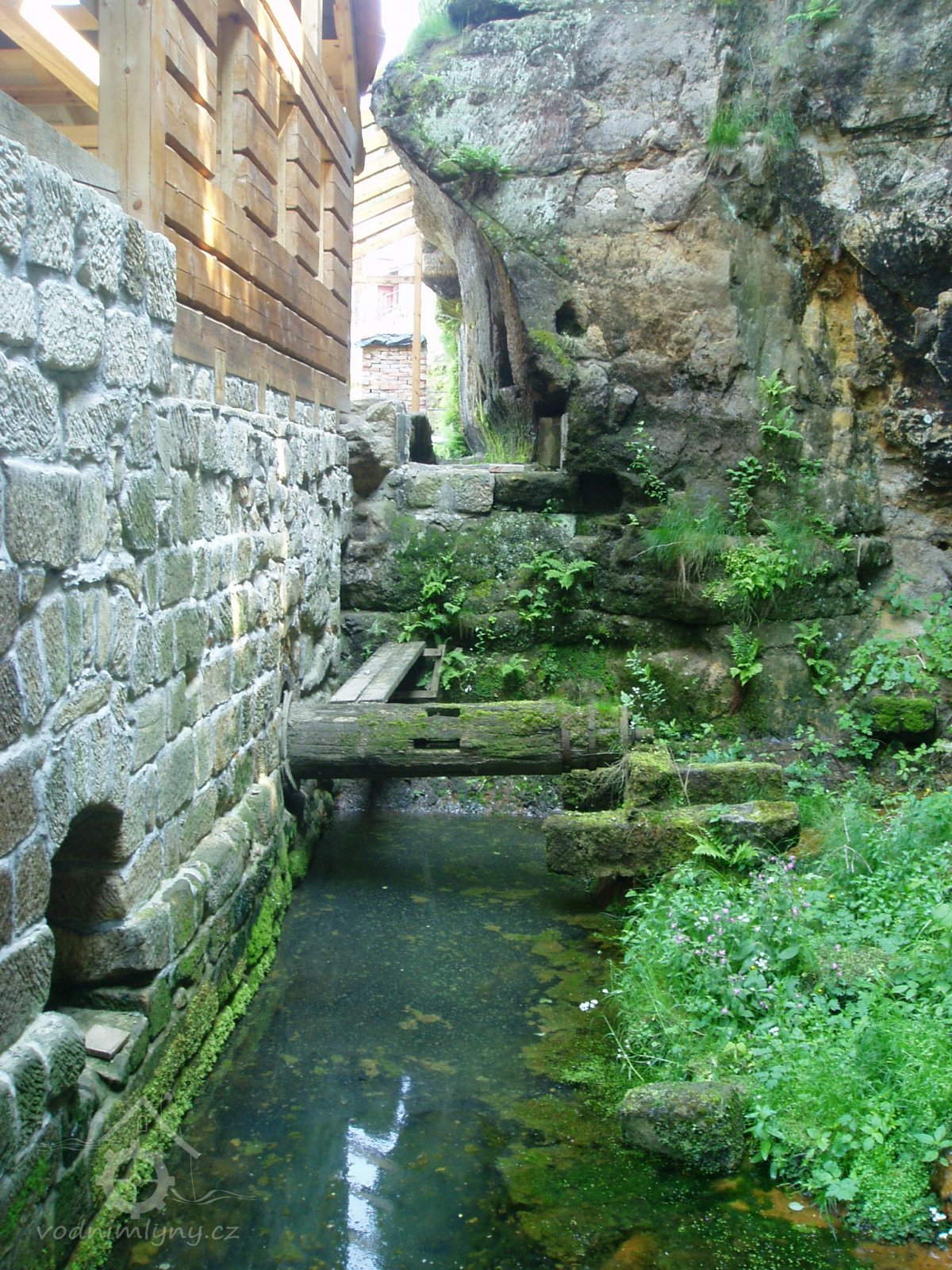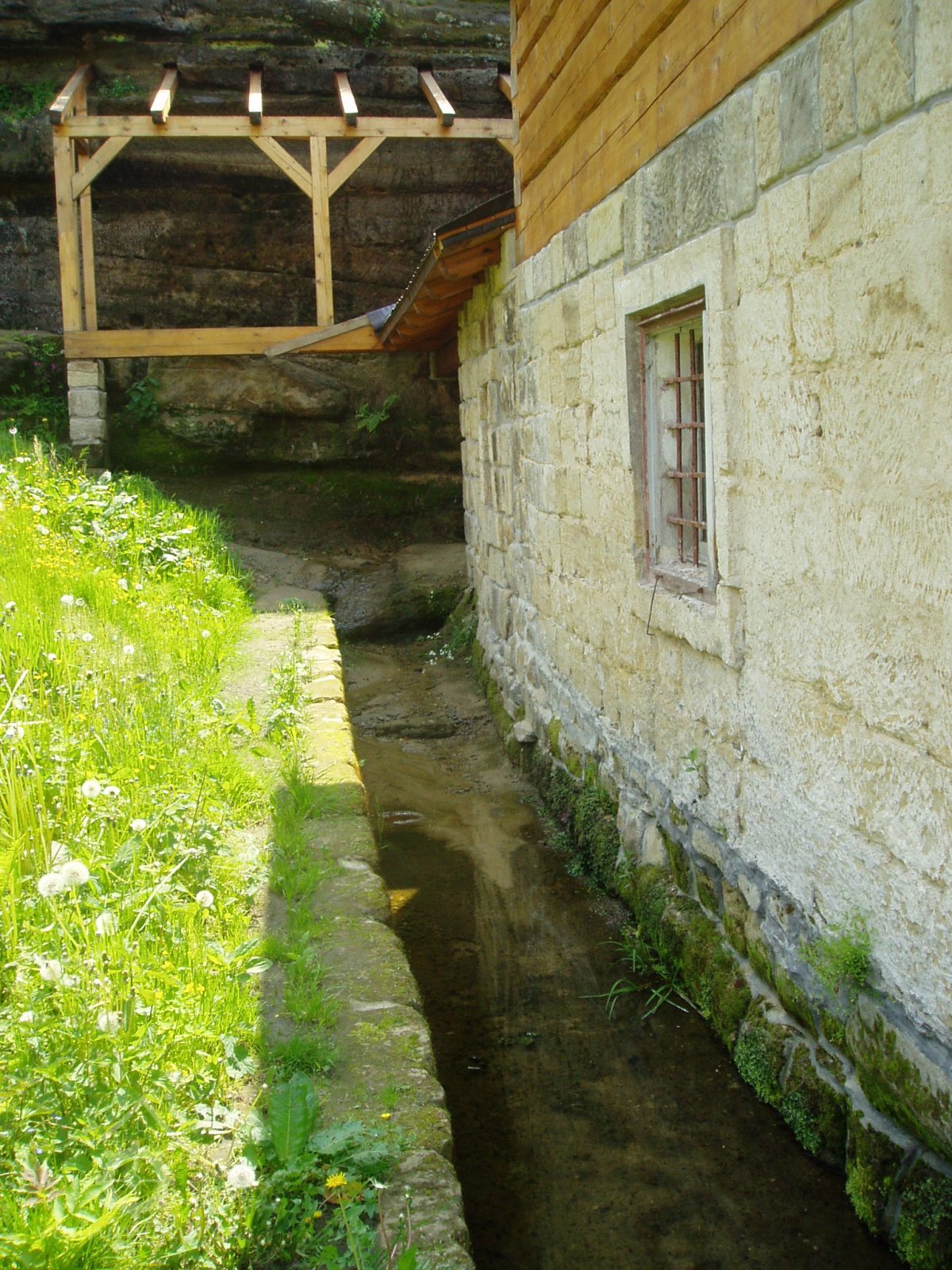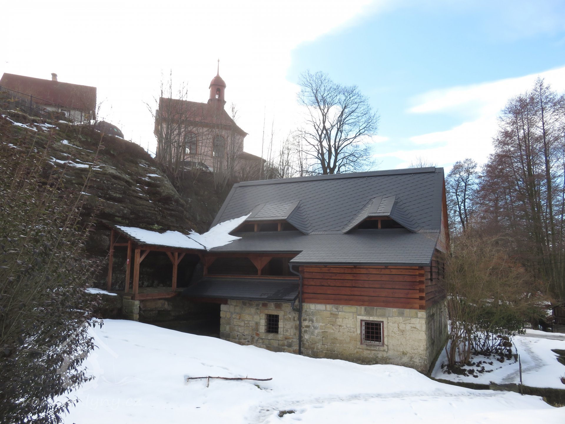 Vlevo od okna je dochována datace 1701, opakující se nad náhonem před mlýnem spolu s dalšími mladšími letopočty. V čelní stěně skalního masivu ústí náhon vedený štolou a následně otevřeným pískovcovým korytem mezi patou skalní stráně a místní komunikací až ke mlýnu pod kaplí sv. Antonína. Lednice s dochovanou hřídelí vodního kola na horní vodu je vymezena vysokou odlámanou stěnou a budovou mlýna.