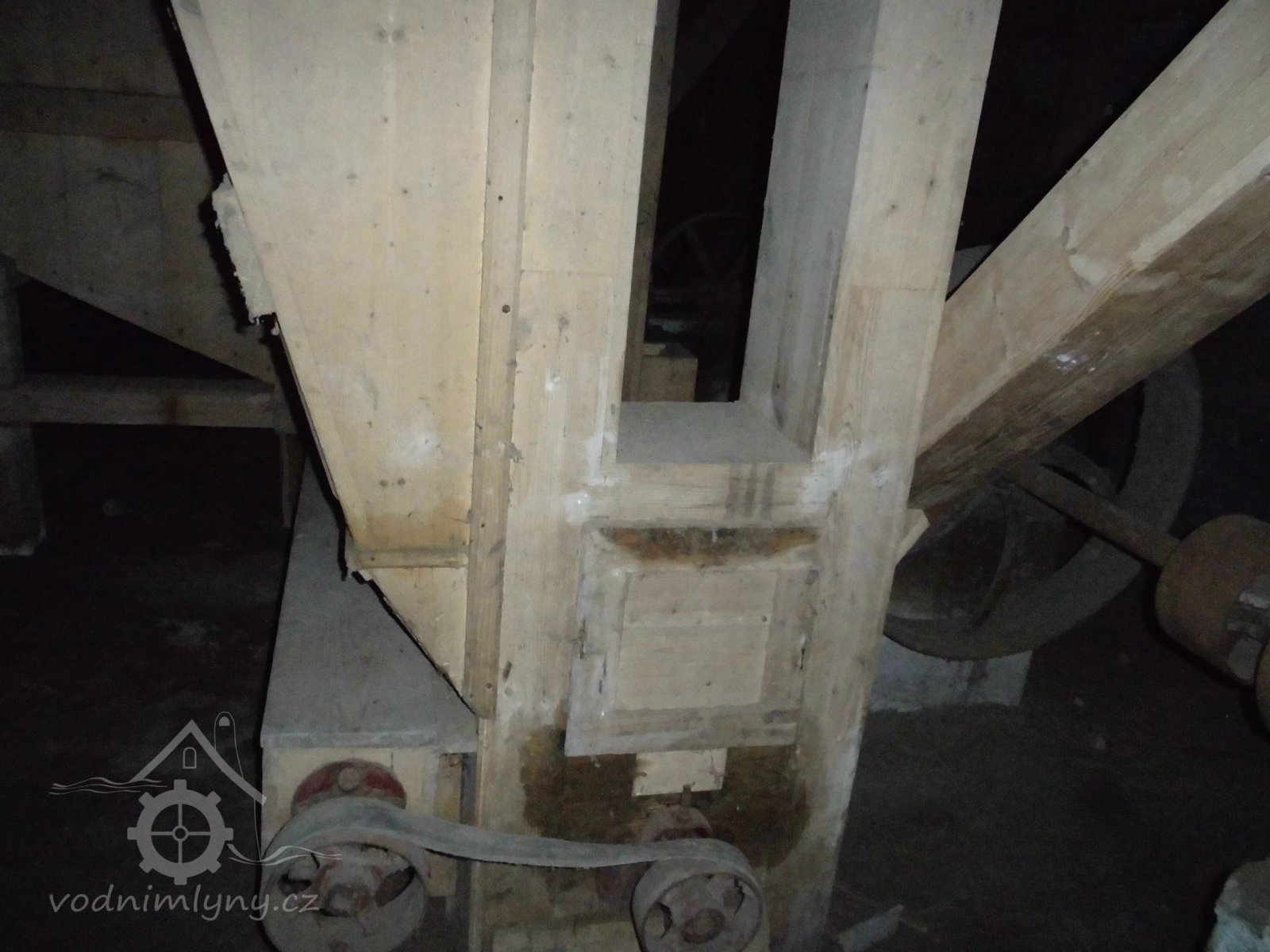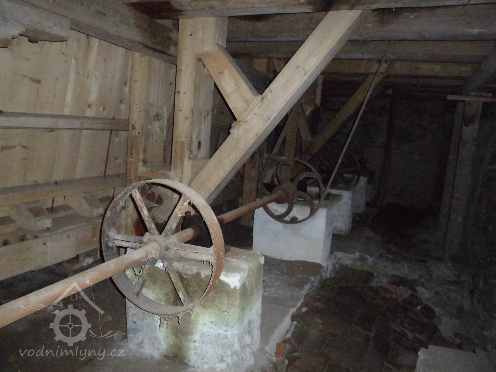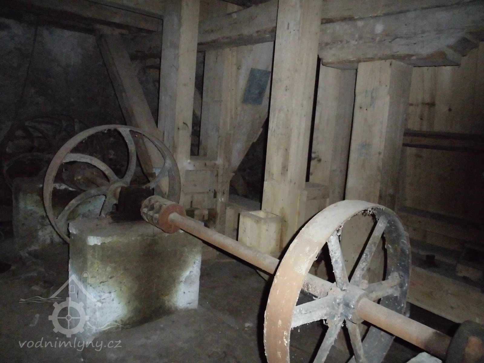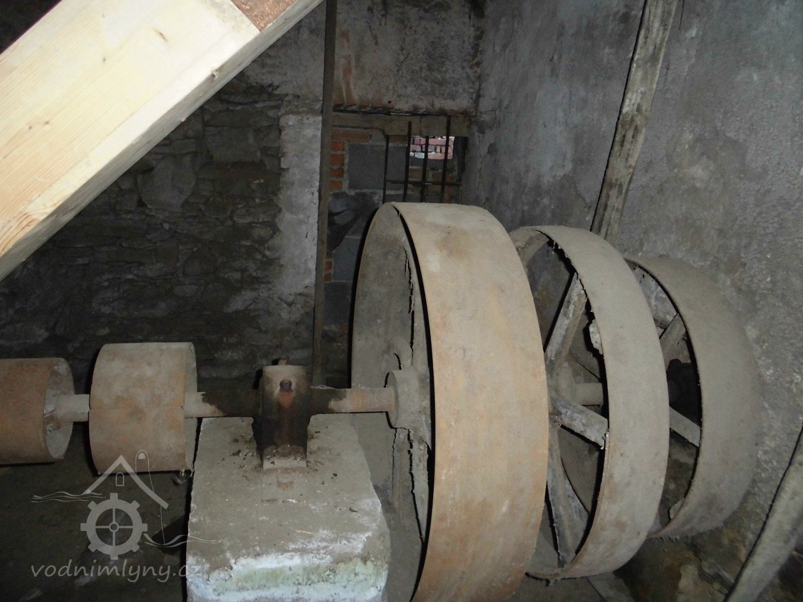 hlavní transmise, v pozadí zazděný prostup pro řemen k turbíně, 2013, © Veselý, (Prvky na obrázku: transmise, řemenice, převody)