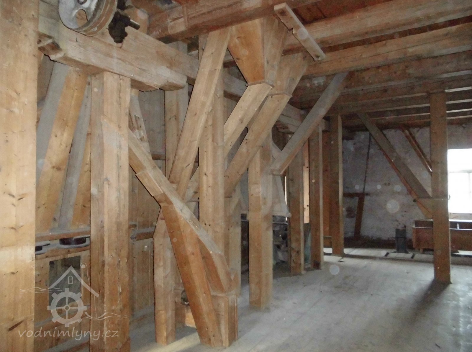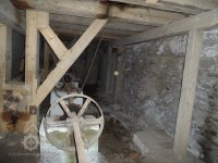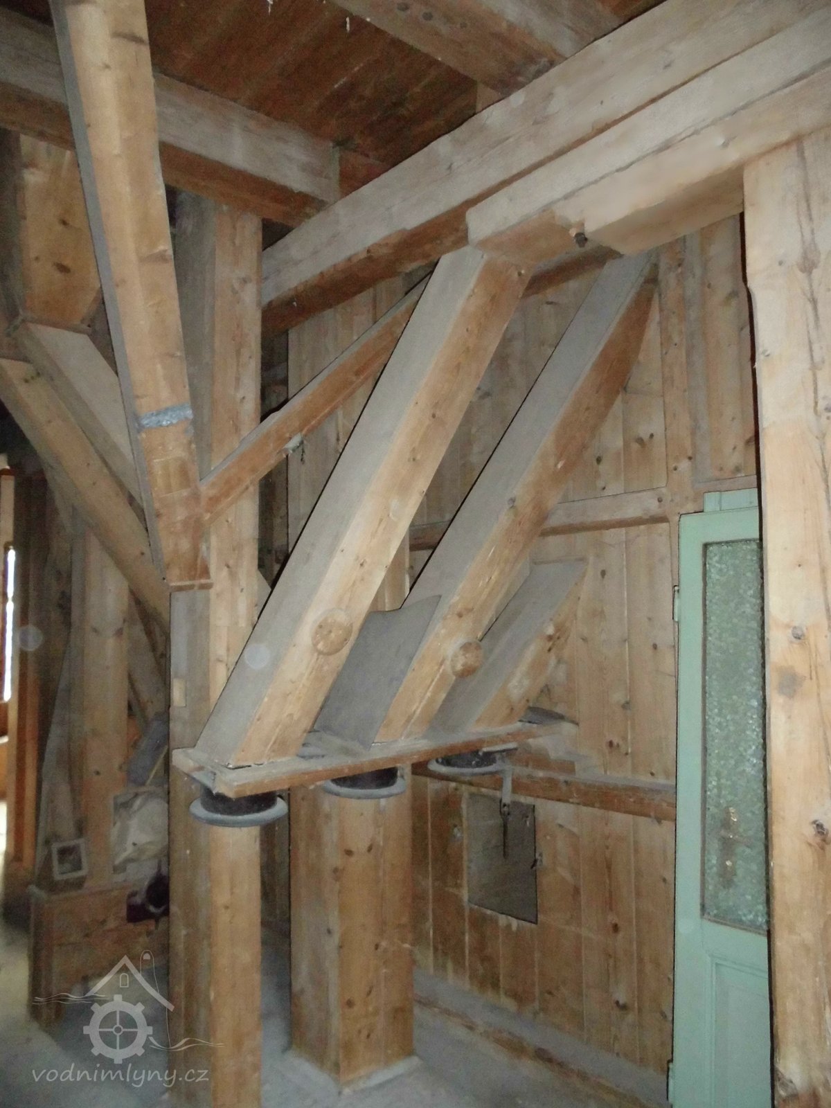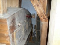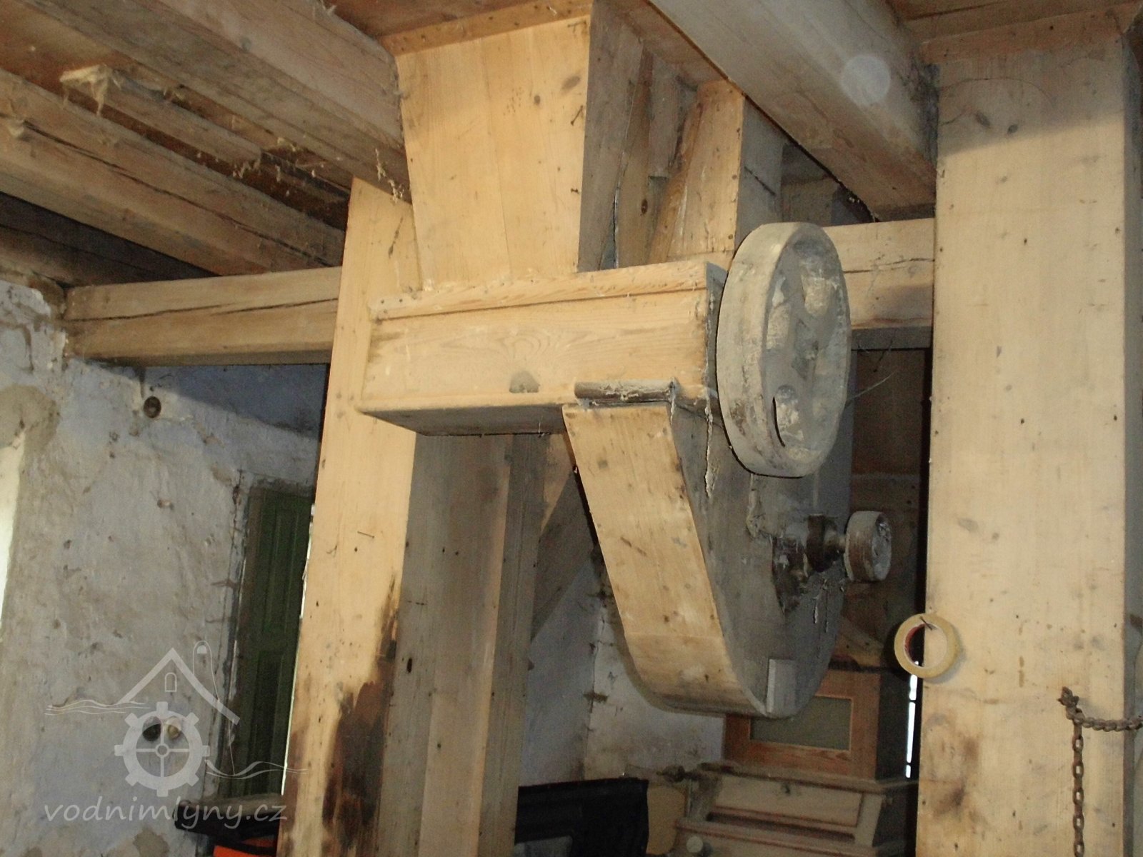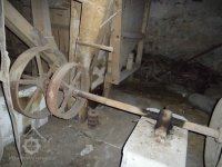 hlavní transmise, v pozadí zazděný prostup pro řemen k turbíně, 2013, © Veselý, (Prvky na obrázku: transmise, řemenice, převody)