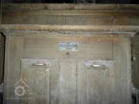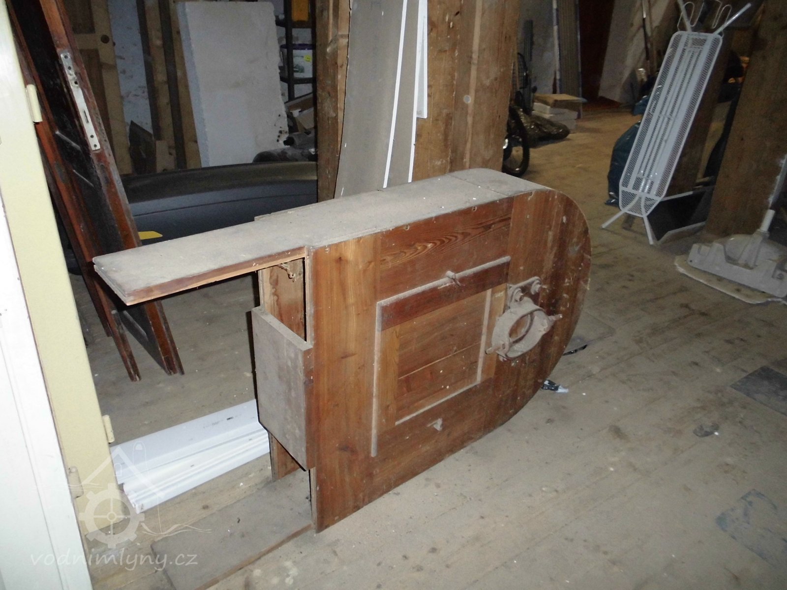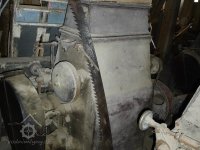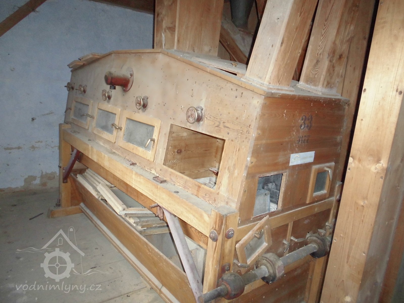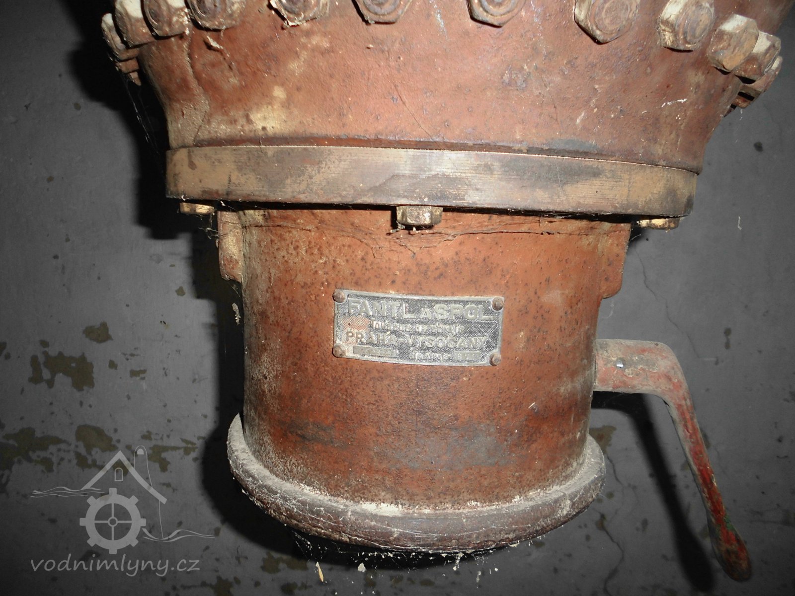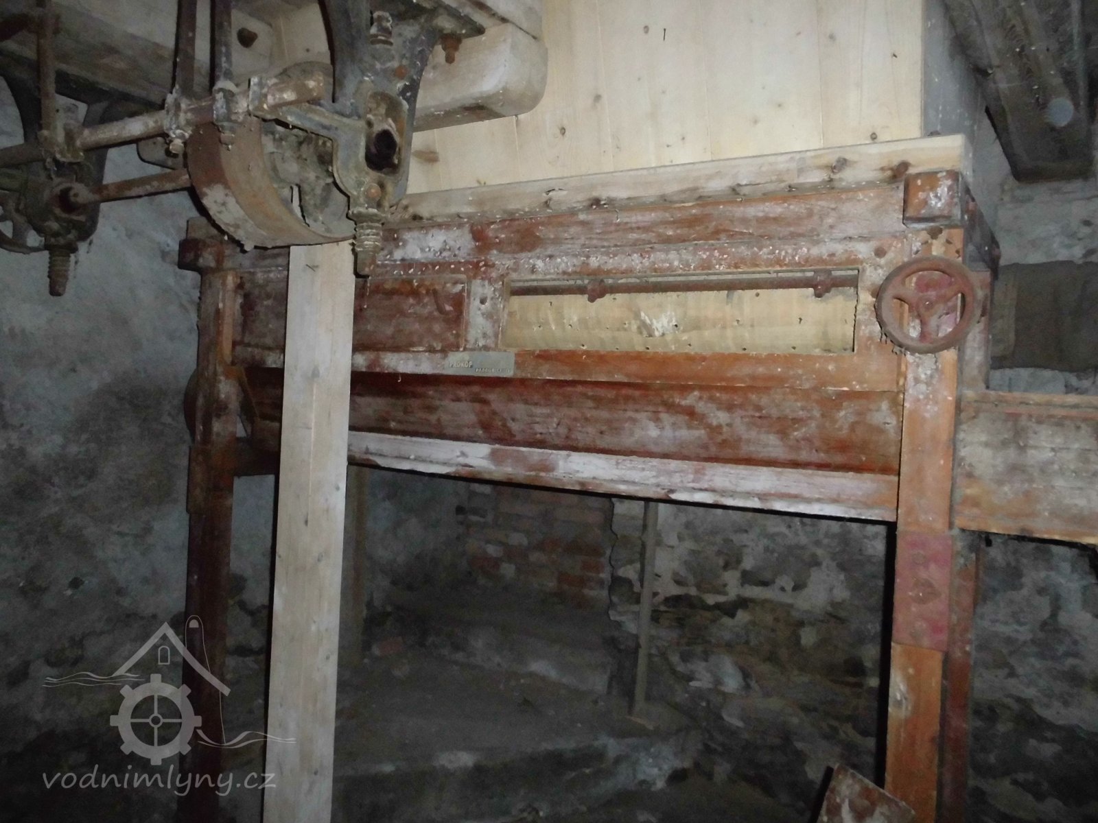 hlavní transmise, v pozadí zazděný prostup pro řemen k turbíně, 2013, © Veselý, (Prvky na obrázku: transmise, řemenice, převody)