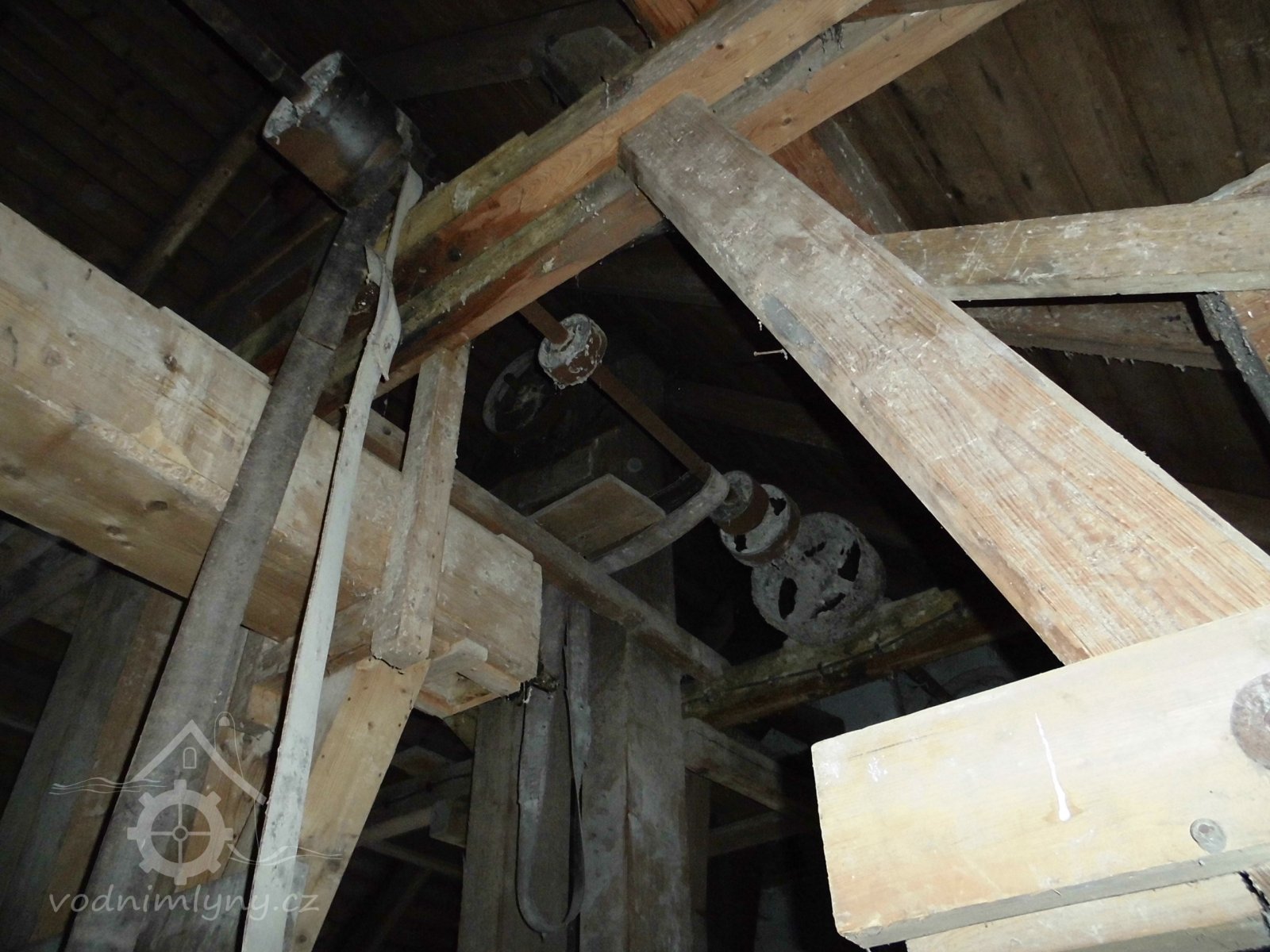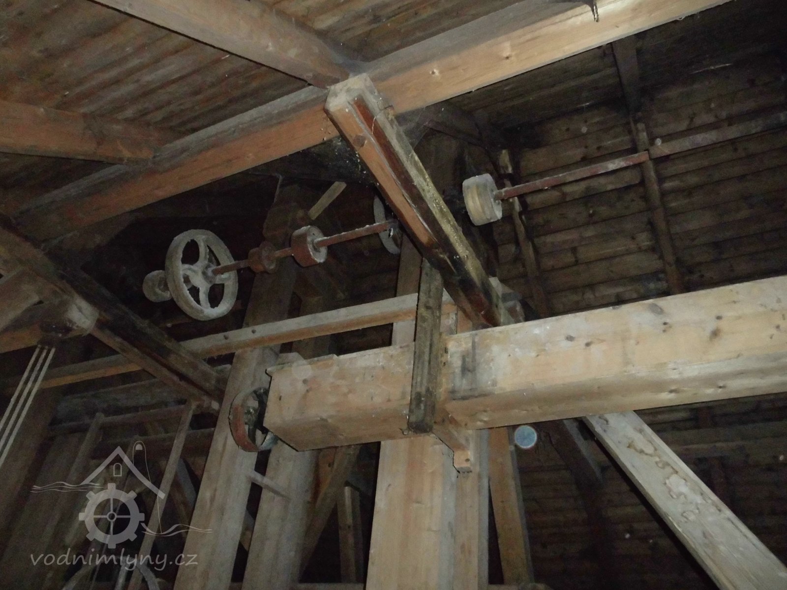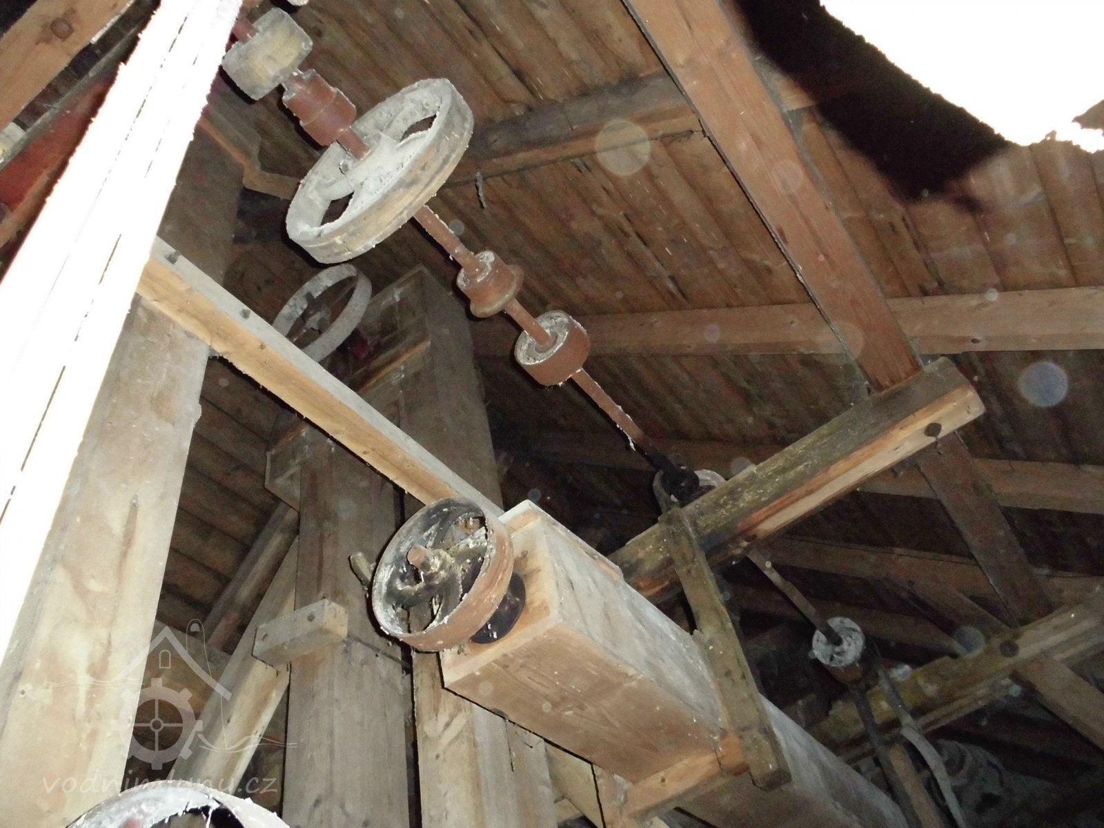 transmise v podstřeší, 2013, © Veselý, (Prvky na obrázku: transmise, řemenice, převody)